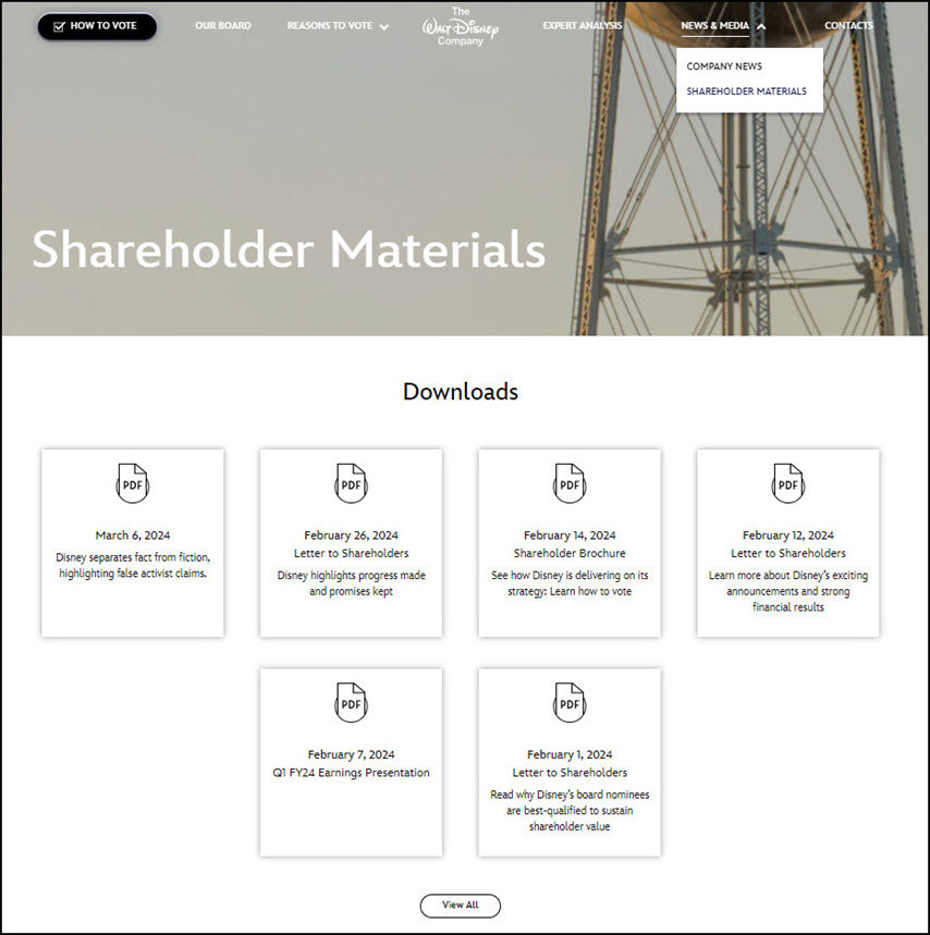 如何投票我们董事会投票的理由华特迪士尼公司专家分析新闻&媒体公司新闻股东材料联系股东材料下载PDF 2024年3月6日迪士尼将事实与虚构分开,突出虚假的维权人士说法。PDF2024年2月26日致股东的信迪士尼强调取得的进展和信守的承诺PDF2024年2月14日股东手册了解迪士尼如何实现其战略:了解如何投票PDF2024年2月12日致股东的信了解更多关于迪士尼激动人心的公告和强劲的财务业绩PDF2024年2月7日Q1 FY24收益演示PDF2024年2月1日致股东的信阅读为什么迪士尼董事会提名人最有资格维持股东价值查看全部