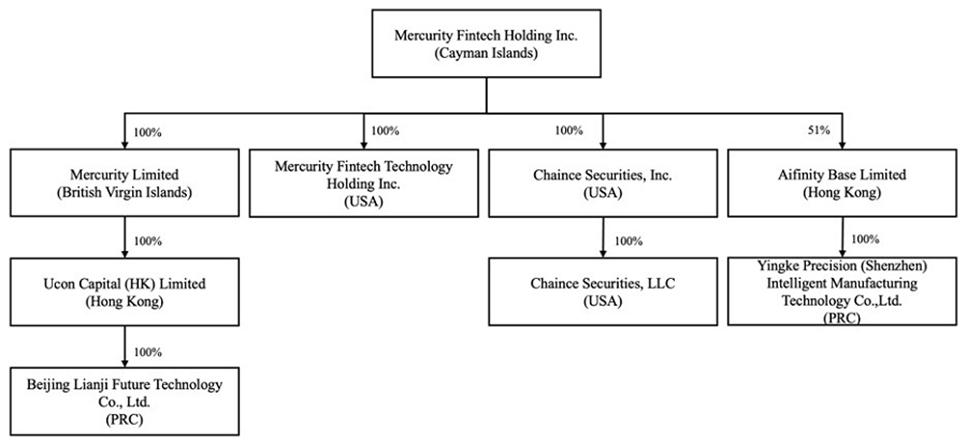 | ● | “我们”、“我们”、“公司”、“本公司”或“我们的”是指Mercurity Fintech Holding Inc.及其合并子公司,包括(i)Mercurity Fintech科技控股公司,(ii)Mercurity Limited,(iii)Ucon Capital(HK)Limited,(iv)北京链基未来科技有限公司,(v)Chaince Securities,(vi)Chaince Securities,LLC,前身为JVDA,LLC,(vii)Aifinity Base Limited,及(viii)盈科精密(深圳)智能制造科技有限公司; | |