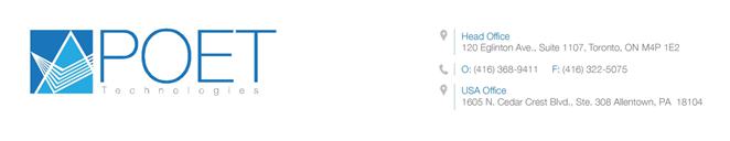 POET技术公司。 埃格林顿大道东1107 – 120号套房 加拿大安大略省多伦多M4P 1E2 电话:(416)368-9411传真:(416)322-5075 |