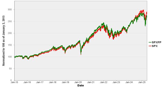 在下图中,“SPXFP”所指的是标普 500期货超额收益指数,“SPX”所指的是标普 500®指数。