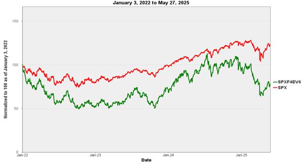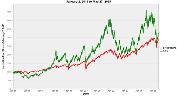 在下图中,“SPXF4EV6”是指标普 500期货40%边缘波动率6%递减指数(美元)ER,“SPX”是指标普 500®指数。