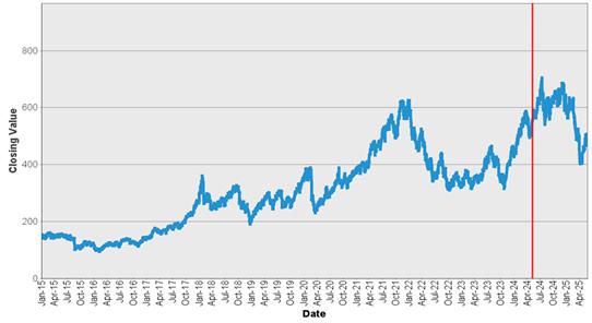 下图列出了假设回测和历史表现的标普 500期货40%边缘波动率6%递减指数(美元)ER与历史表现的对比,对比了标普 500®指数。第一张图显示了2015年1月2日至2025年5月27日期间的比较业绩数据,每一张都标准化为2015年1月2日的收盘值为100.00,以便于进行比较。第二张图显示了2022年1月3日至2025年5月27日期间的比较业绩数据,每一张都标准化为2022年1月3日的收盘值为100.00,以便于进行比较。标普 500指数的表现®下面显示的指数是其价格回报表现——即不反映股息的表现。标普 500指数的总回报表现®指数(即反映股息的表现)将大于下面显示的价格回报表现。