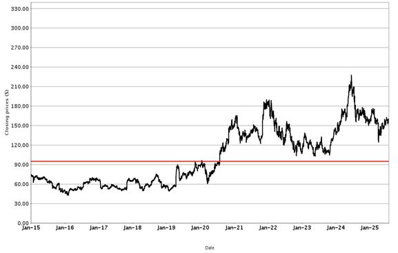 下图列出2015年1月1日至2025年7月25日期间标的的历史收盘价。红线代表票息门槛和屏障值。我们从彭博金融市场获得图表中的信息,未经独立调查。我们无法向您保证,标的的表现将导致您的所有初始投资的回报。