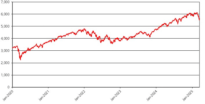 | 标普 500®指数–每日指数收盘值 2020年1月1日至2025年3月14日 |