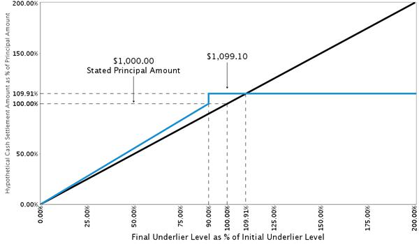 以下图表还说明了如果最终基础水平(以初始基础水平的百分比表示)是横轴显示的任何假设水平,我们将在规定的到期日就贵公司的票据支付的假设现金结算金额(以贵公司票据本金的百分比表示)。图表显示,任何假设的最终基础水平(以初始基础水平的百分比表示)低于阈值水平将导致假设的现金结算金额低于票据本金金额的100.00%(纵轴上100.00%标记下方的部分),从而导致票据持有人的本金损失。该图表还显示,任何假设的最终基础水平大于或等于阈值水平(横轴上90.000%标记的右截面)都将导致您的投资回报上限。