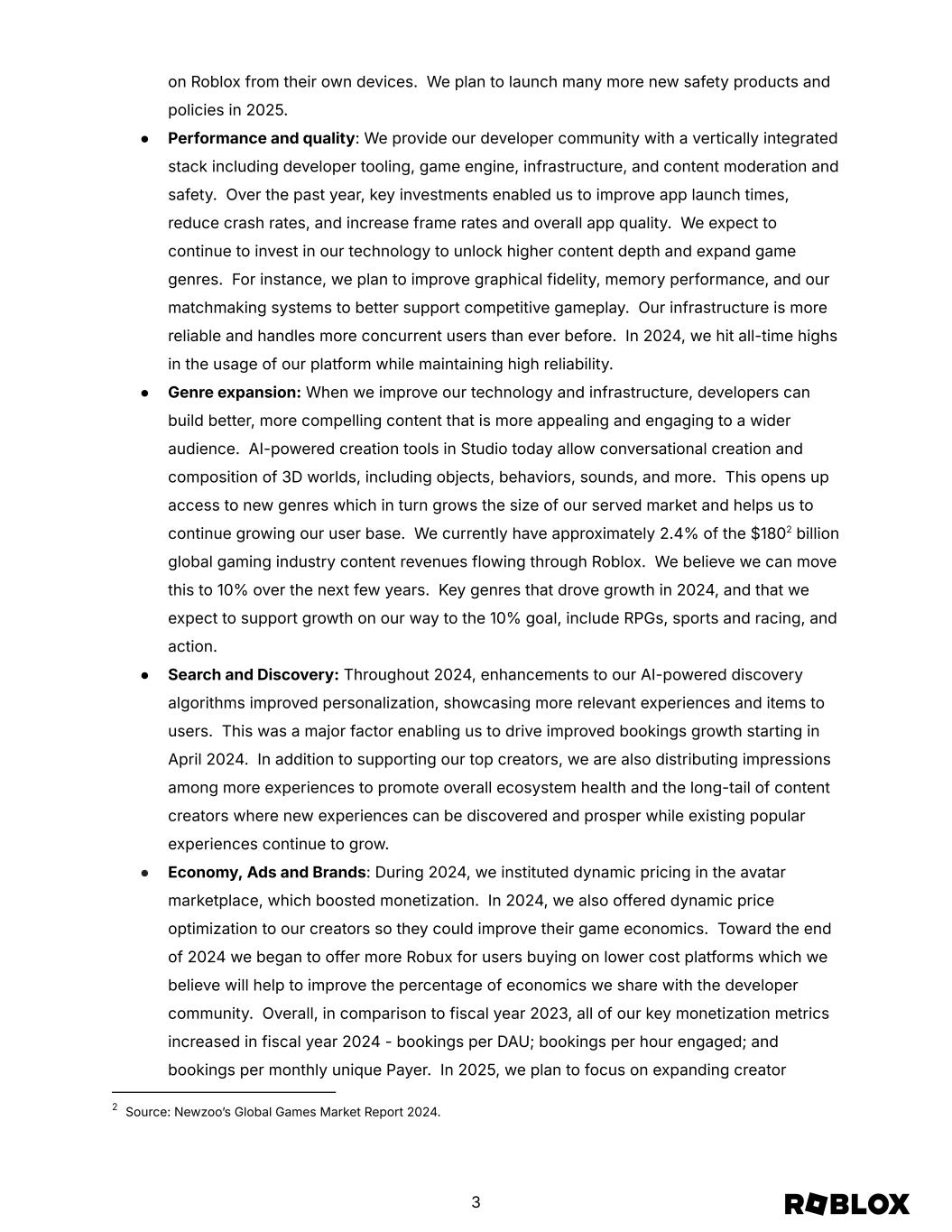 通过他们自己的设备在Roblox上发布。我们计划在2025年推出更多新的安全产品和政策。●性能和质量:我们为我们的开发者社区提供垂直集成的堆栈,包括开发者工具、游戏引擎、基础设施以及内容审核和安全。在过去一年中,关键的投资使我们能够改善应用程序的启动时间,降低崩溃率,并提高帧率和整体应用程序质量。我们预计将继续投资于我们的技术,以解锁更高的内容深度并扩展游戏类型。例如,我们计划提高图形保真度、内存性能,以及我们的匹配系统,以更好地支持竞争性游戏玩法。我们的基础设施比以往任何时候都更可靠,处理更多的并发用户。2024年,我们的平台使用率创下历史新高,同时保持了高可靠性。●类型扩展:当我们改进我们的技术和基础设施时,开发人员可以构建更好、更引人注目的内容,对更广泛的受众更具吸引力和吸引力。Studio中的AI驱动的创作工具如今允许对话式创作和合成3D世界,包括对象、行为、声音等等。这打开了对新类型的访问,进而扩大了我们所服务的市场的规模,并帮助我们继续扩大我们的用户群。目前,在1802亿美元的全球游戏产业内容收入中,我们大约有2.4%的收入是通过Roblox流入的。我们相信,我们可以在未来几年内将这一比例提高到10%。推动2024年增长的关键类型,以及我们预计将在实现10%目标的道路上支持增长的关键类型,包括RPG、体育和赛车以及动作。● Search and Discovery:在整个2024年,我们AI驱动的发现算法的增强改进了个性化,向用户展示了更多相关体验和项目。这是使我们能够从2024年4月开始推动预订量增长改善的一个主要因素。除了支持我们的顶级创作者,我们还在更多体验中分配印象,以促进整体生态系统健康和内容创作者的长尾,在这些体验中,新的体验可以被发现并繁荣,而现有的流行体验则继续增长。●经济、广告和品牌:在2024年期间,我们在头像市场建立了动态定价,这促进了货币化。在2024年,我们还向我们的创作者提供了动态价格优化,这样他们就可以提高他们的游戏经济性。到2024年底,我们开始为在低成本平台上购买的用户提供更多的Robux,我们认为这将有助于提高我们与开发者社区分享的经济百分比。总体而言,与2023财年相比,我们在2024财年的所有关键货币化指标都有所增加——每日活用户的预订量;每小时参与的预订量;以及每个月唯一付款人的预订量。2025年,我们计划重点拓展创作者2来源:Newzoo的《2024年全球游戏市场报告》。3