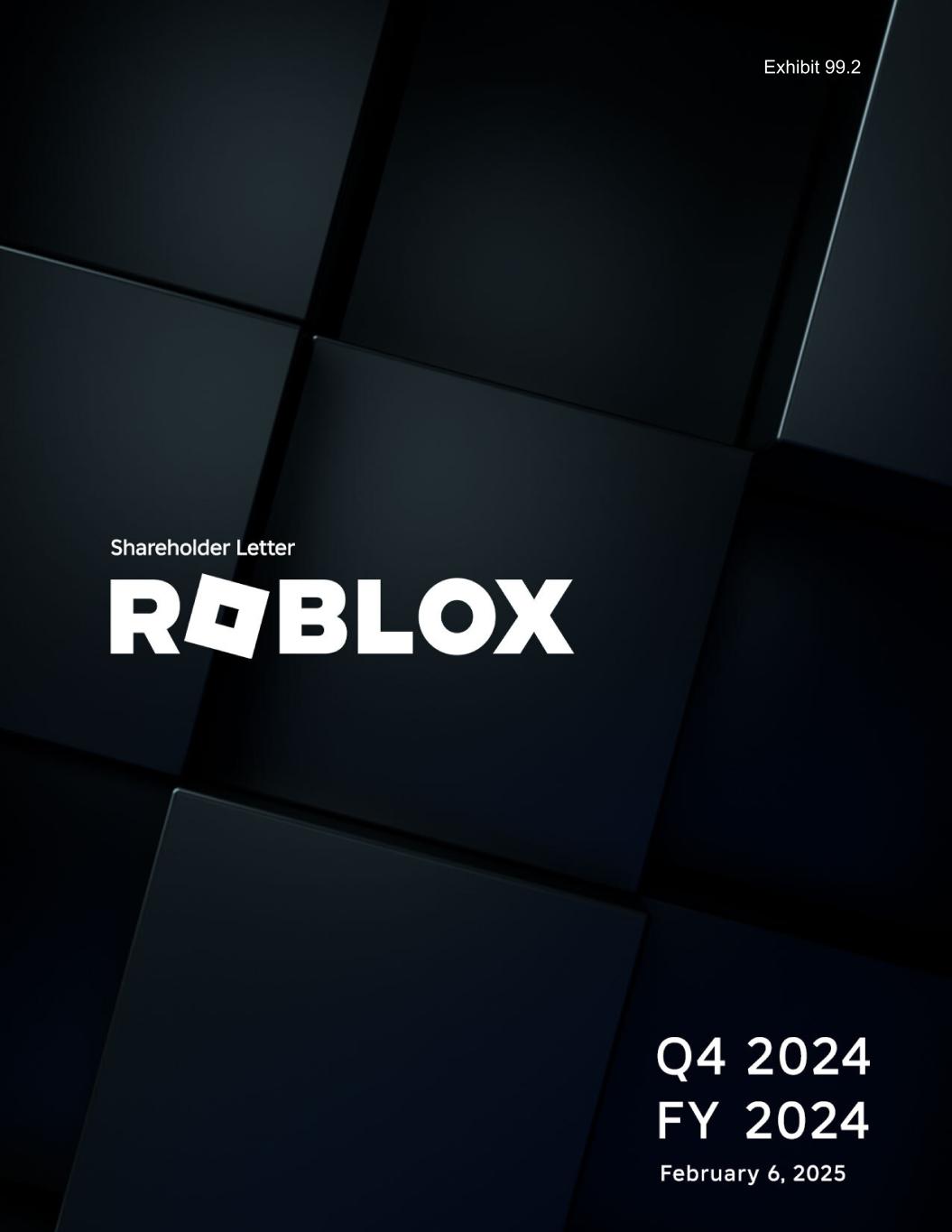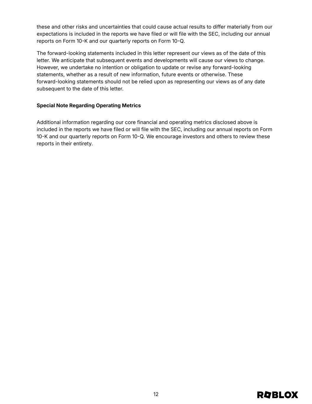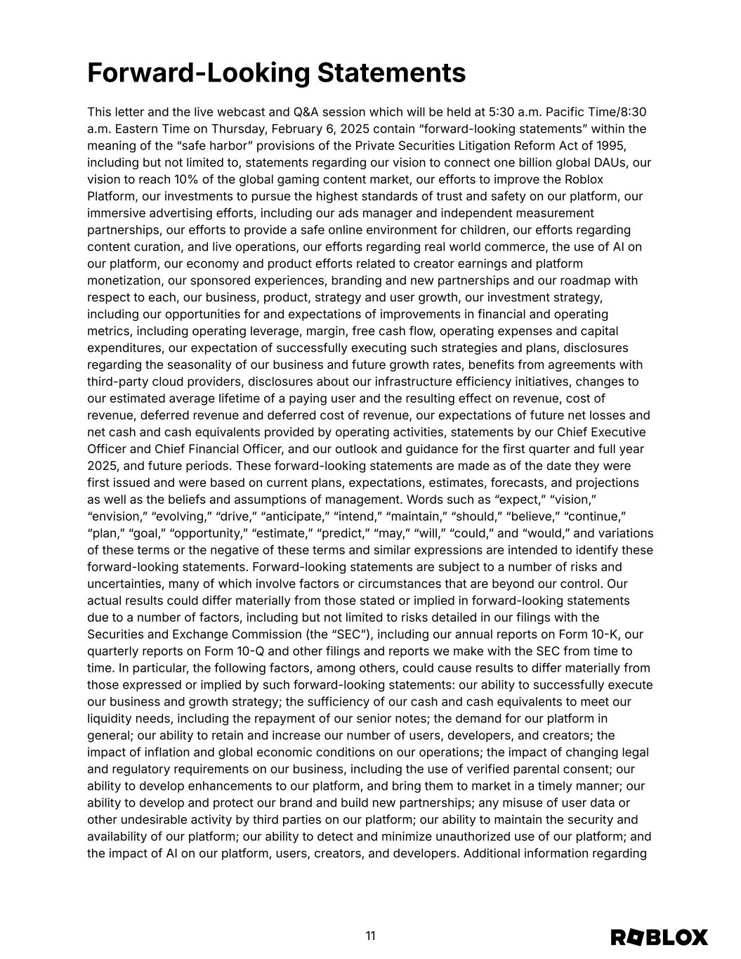 前瞻性陈述这封信以及将于太平洋时间2025年2月6日(星期四)上午5:30/美国东部时间上午8:30举行的网络直播和问答环节包含“1995年《私人证券诉讼改革法案》“安全港”条款含义内的前瞻性陈述,包括但不限于有关我们连接十亿全球DAU的愿景、我们达到全球游戏内容市场10%的愿景、我们努力改进Roblox平台、我们为追求平台上最高标准的信任和安全而进行的投资、我们沉浸式广告努力,包括我们的广告经理和独立衡量合作伙伴关系,我们为儿童提供安全的在线环境所做的努力,我们在内容管理和直播运营方面所做的努力,我们在现实世界商业方面所做的努力,在我们的平台上使用人工智能,我们的经济和与创作者收益和平台货币化相关的产品努力,我们的赞助体验、品牌和新的合作伙伴关系以及我们在每一方面的路线图,我们的业务、产品、战略和用户增长,我们的投资战略,包括我们在财务和运营指标方面的改善机会和预期,包括运营杠杆、利润率、自由现金流,运营费用和资本支出,我们对成功执行此类战略和计划的预期,关于我们业务季节性和未来增长率的披露,与第三方云提供商的协议带来的收益,关于我们基础设施效率举措的披露,我们对付费用户的估计平均生命周期的变化以及由此对收入、收入成本、递延收入和递延收入成本的影响,我们对未来净亏损以及经营活动提供的净现金和现金等价物的预期,我们的首席执行官和首席财务官的报表,以及我们对2025年第一季度和全年以及未来期间的展望和指导。这些前瞻性陈述是在首次发布之日作出的,基于当前的计划、预期、估计、预测和预测以及管理层的信念和假设。“预期”、“愿景”、“设想”、“演变中的”、“驱动”、“预期”、“打算”、“维持”、“应该”、“丨相信”、“继续”、“计划”、“目标”、“机会”、丨“估计”、丨“预测”、丨“可能”、丨“将”、丨和“将”等词语,以及这些术语的变体或这些术语的否定词和类似表达方式旨在识别这些前瞻性陈述。前瞻性陈述受到许多风险和不确定性的影响,其中许多涉及我们无法控制的因素或情况。由于多种因素,我们的实际结果可能与前瞻性陈述中所述或暗示的结果存在重大差异,这些因素包括但不限于我们向美国证券交易委员会(“SEC”)提交的文件中详述的风险,包括我们关于Form 10K的年度报告、我们关于Form 10Q的季度报告以及我们不时向SEC提交的其他文件和报告。特别是,除其他外,以下因素可能导致结果与此类前瞻性陈述中明示或暗示的结果存在重大差异:我们成功执行业务和增长战略的能力;我们的现金和现金等价物是否足以满足我们的流动性需求,包括偿还我们的优先票据;对我们平台的总体需求;我们保留和增加用户、开发者和创作者数量的能力;通货膨胀和全球经济状况对我们运营的影响;不断变化的法律和监管要求对我们业务的影响,包括使用经过验证的父母同意;我们开发平台增强功能并将其及时推向市场的能力;我们开发和保护品牌以及建立新合作伙伴关系的能力;第三方在我们平台上滥用用户数据或其他不良活动的任何行为;我们维护平台安全性和可用性的能力;我们检测和尽量减少未经授权使用我们平台的能力;以及人工智能对我们平台、用户、创作者和开发者的影响。关于11的补充信息