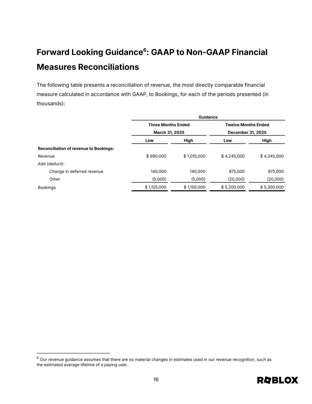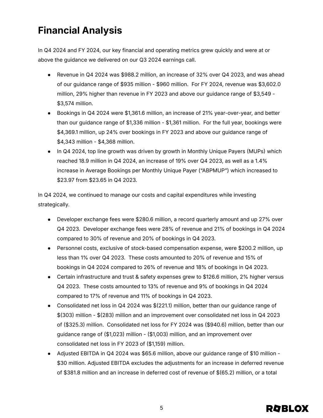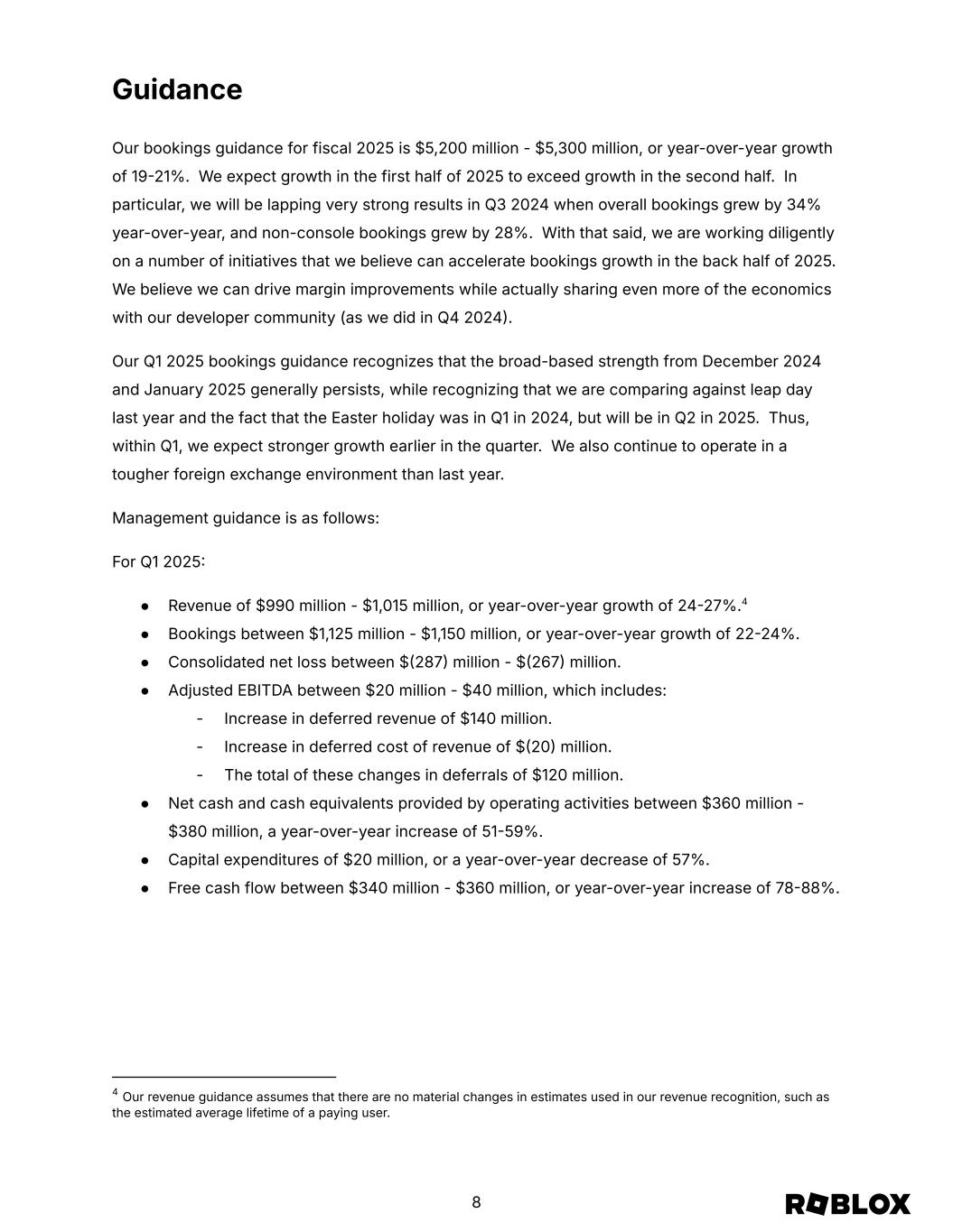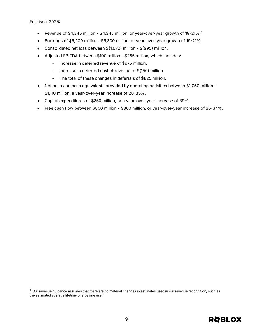 前瞻性陈述这封信以及将于太平洋时间2025年2月6日(星期四)上午5:30/美国东部时间上午8:30举行的网络直播和问答环节包含“1995年《私人证券诉讼改革法案》“安全港”条款含义内的前瞻性陈述,包括但不限于有关我们连接十亿全球DAU的愿景、我们达到全球游戏内容市场10%的愿景、我们努力改进Roblox平台、我们为追求平台上最高标准的信任和安全而进行的投资、我们沉浸式广告努力,包括我们的广告经理和独立衡量合作伙伴关系,我们为儿童提供安全的在线环境所做的努力,我们在内容管理和直播运营方面所做的努力,我们在现实世界商业方面所做的努力,在我们的平台上使用人工智能,我们的经济和与创作者收益和平台货币化相关的产品努力,我们的赞助体验、品牌和新的合作伙伴关系以及我们在每一方面的路线图,我们的业务、产品、战略和用户增长,我们的投资战略,包括我们在财务和运营指标方面的改善机会和预期,包括运营杠杆、利润率、自由现金流,运营费用和资本支出,我们对成功执行此类战略和计划的预期,关于我们业务季节性和未来增长率的披露,与第三方云提供商的协议带来的收益,关于我们基础设施效率举措的披露,我们对付费用户的估计平均生命周期的变化以及由此对收入、收入成本、递延收入和递延收入成本的影响,我们对未来净亏损以及经营活动提供的净现金和现金等价物的预期,我们的首席执行官和首席财务官的报表,以及我们对2025年第一季度和全年以及未来期间的展望和指导。这些前瞻性陈述是在首次发布之日作出的,基于当前的计划、预期、估计、预测和预测以及管理层的信念和假设。“预期”、“愿景”、“设想”、“演变中的”、“驱动”、“预期”、“打算”、“维持”、“应该”、“丨相信”、“继续”、“计划”、“目标”、“机会”、丨“估计”、丨“预测”、丨“可能”、丨“将”、丨和“将”等词语,以及这些术语的变体或这些术语的否定词和类似表达方式旨在识别这些前瞻性陈述。前瞻性陈述受到许多风险和不确定性的影响,其中许多涉及我们无法控制的因素或情况。由于多种因素,我们的实际结果可能与前瞻性陈述中所述或暗示的结果存在重大差异,这些因素包括但不限于我们向美国证券交易委员会(“SEC”)提交的文件中详述的风险,包括我们关于Form 10K的年度报告、我们关于Form 10Q的季度报告以及我们不时向SEC提交的其他文件和报告。特别是,除其他外,以下因素可能导致结果与此类前瞻性陈述中明示或暗示的结果存在重大差异:我们成功执行业务和增长战略的能力;我们的现金和现金等价物是否足以满足我们的流动性需求,包括偿还我们的优先票据;对我们平台的总体需求;我们保留和增加用户、开发者和创作者数量的能力;通货膨胀和全球经济状况对我们运营的影响;不断变化的法律和监管要求对我们业务的影响,包括使用经过验证的父母同意;我们开发平台增强功能并将其及时推向市场的能力;我们开发和保护品牌以及建立新合作伙伴关系的能力;第三方在我们平台上滥用用户数据或其他不良活动的任何行为;我们维护平台安全性和可用性的能力;我们检测和尽量减少未经授权使用我们平台的能力;以及人工智能对我们平台、用户、创作者和开发者的影响。关于11的补充信息