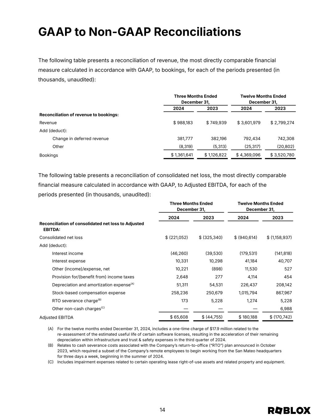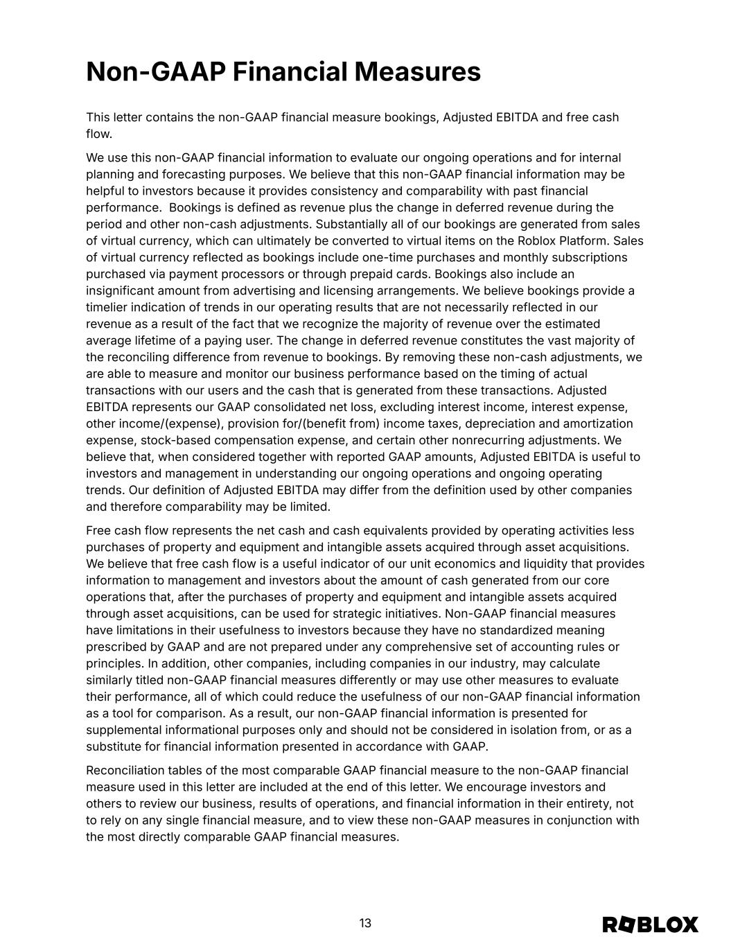 非GAAP财务指标这封信包含非GAAP财务指标预订、调整后EBITDA和自由现金流。我们使用这些非GAAP财务信息来评估我们正在进行的运营,并用于内部规划和预测目的。我们认为,这种非GAAP财务信息可能对投资者有所帮助,因为它提供了与过去财务业绩的一致性和可比性。预订定义为收入加上期间递延收入的变化和其他非现金调整。基本上我们所有的预订都是从虚拟货币的销售中产生的,这些虚拟货币最终可以在Roblox平台上转换为虚拟物品。反映为预订的虚拟货币销售包括通过支付处理器或通过预付卡购买的一次性购买和月度订阅。预订还包括来自广告和许可安排的微不足道的金额。我们认为,由于我们在付费用户的估计平均生命周期内确认了大部分收入,因此预订可以更及时地显示我们的经营业绩趋势,而这些趋势并不一定反映在我们的收入中。递延收入的变化构成了从收入到预订量的调节差异的绝大部分。通过去除这些非现金调整,我们能够根据与用户的实际交易的时间以及这些交易产生的现金来衡量和监控我们的业务绩效。调整后EBITDA代表我们的GAAP综合净亏损,不包括利息收入、利息费用、其他收入/(费用)、所得税拨备/(受益于)、折旧和摊销费用、基于股票的补偿费用以及某些其他非经常性调整。我们认为,当与报告的GAAP金额一起考虑时,调整后的EBITDA有助于投资者和管理层了解我们的持续运营和持续运营趋势。我们对调整后EBITDA的定义可能与其他公司使用的定义不同,因此可比性可能有限。自由现金流指经营活动提供的现金和现金等价物净额减去购买的财产和设备以及通过资产收购获得的无形资产。我们认为,自由现金流是衡量我们单位经济和流动性的有用指标,它向管理层和投资者提供有关我们核心业务产生的现金数量的信息,这些现金在购买通过资产收购获得的财产和设备以及无形资产后,可用于战略举措。非GAAP财务指标对投资者的有用性存在局限性,因为它们没有GAAP规定的标准化含义,也不是根据任何一套全面的会计规则或原则编制的。此外,其他公司,包括我们行业的公司,可能会以不同的方式计算类似标题的非GAAP财务指标,或者可能会使用其他指标来评估其业绩,所有这些都可能降低我们的非GAAP财务信息作为比较工具的有用性。因此,我们提供的非GAAP财务信息仅用于补充信息目的,不应与根据GAAP提供的财务信息分开考虑,或作为财务信息的替代。最具可比性的GAAP财务指标与本函中使用的非GAAP财务指标的对账表格包含在本函末尾。我们鼓励投资者和其他人全面审查我们的业务、经营业绩和财务信息,不要依赖任何单一的财务指标,并结合最直接可比的GAAP财务指标来看待这些非GAAP指标。13