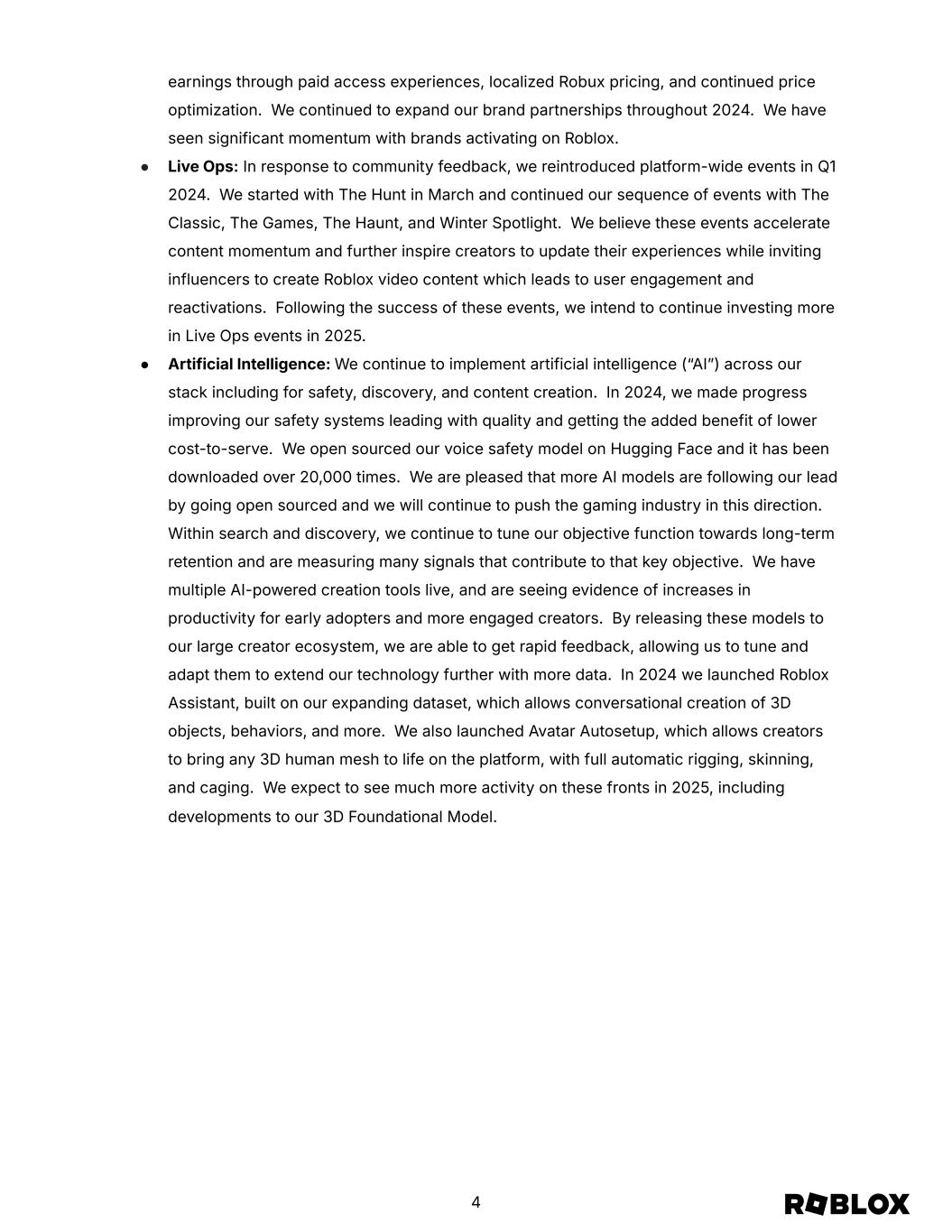 通过付费访问体验、本地化的Robux定价以及持续的价格优化获得收益。我们在整个2024年继续扩大我们的品牌合作伙伴关系。我们已经看到有品牌在Roblox上激活的势头非常明显。● Live Ops:为响应社区反馈,我们在2024年Q1重新引入了全平台活动。我们从三月份的狩猎开始,继续我们的赛事序列,包括精英赛、运动会、闹鬼和冬季聚光灯。我们相信,这些活动加速了内容势头,并进一步激发创作者更新他们的体验,同时邀请有影响力的人创作Roblox视频内容,从而带来用户参与和重新激活。继这些活动取得成功后,我们打算在2025年继续对Live Ops活动进行更多投资。●人工智能:我们继续在我们的堆栈中实施人工智能(“AI丨),包括用于安全、发现和内容创建。2024年,我们取得了进展,以质量领先的方式改进了我们的安全系统,并获得了更低的服务成本带来的额外好处。我们在Hugging Face上开源了我们的语音安全模型,下载量超2万次。我们很高兴有更多的AI模型通过开源的方式跟随我们,我们将继续推动游戏行业朝这个方向发展。在搜索和发现中,我们继续将我们的目标函数调整为长期保留,并正在测量有助于实现这一关键目标的许多信号。我们有多个人工智能驱动的创作工具正在上线,并且正在看到早期采用者和更多参与的创作者的生产力提高的证据。通过向我们的大型创作者生态系统发布这些模型,我们能够获得快速反馈,从而使我们能够调整和调整它们,从而通过更多数据进一步扩展我们的技术。2024年,我们推出了Roblox助手,它建立在我们扩展的数据集之上,它允许对话式创建3D对象、行为等。我们还推出了Avatar AutoSetup,它允许创作者在平台上让任何3D人肉网格变得栩栩如生,具有全自动索具、剥皮和笼子。我们预计2025年在这些方面会有更多的活动,包括我们的3D基础模型的发展。4