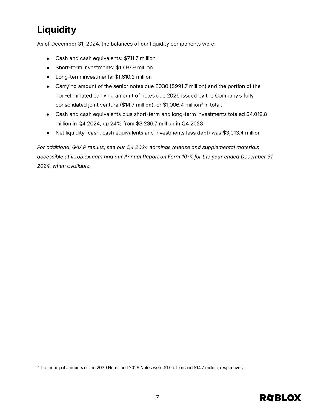 流动性截至2024年12月31日,我们的流动性部分余额为:●现金和现金等价物:7.117亿美元●短期投资:16.979亿美元●长期投资:16.102亿美元● 2030年到期的优先票据的账面金额9.917亿美元)和公司完全合并的合资企业发行的2026年到期的票据的未消除账面金额的部分1470万美元),或总计10.064亿美元3。● 2024年第四季度现金和现金等价物加上短期和长期投资总额为40.198亿美元,比2023年第四季度的32.367亿美元增长24% ●净流动性(现金、现金等价物和投资减去债务)为30.134亿美元,有关额外的GAAP结果,请参阅我们的2024年第四季度收益发布和补充材料,可在ir.roblox.com上查阅,以及我们截至2024年12月31日止年度的10K表格年度报告(如有)。3 2030年票据和2026年票据的本金金额分别为10.0亿美元和14.7百万美元。7