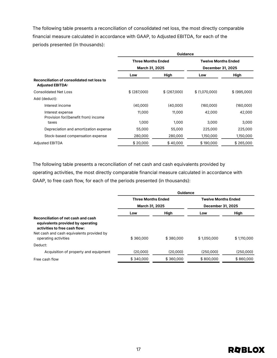 下表列出了根据公认会计原则计算的最直接可比财务指标——合并净亏损与调整后EBITDA的对账情况,列报的每个期间(单位:千):指引截至2025年3月31日的三个月截至2025年12月31日的十二个月,2025年低-高-低-高合并净亏损与调整后EBITDA合并净亏损的对账287,000美元267,000美元1,070,000美元995,000美元加(减)项:利息收入40,00040,000160,000160,000利息支出11,00011,00042,00042,000所得税准备金/(受益)1,0001,0003,0003,000折旧和摊销费用55,00055,000225,000225,000基于股票的补偿费用280,00028,0001,150,0001,150,000调整后EBITDA 20,000美元40,000美元190,000美元265,000美元下表列出了经营活动提供的净现金和现金等价物的对账,这是按照公认会计原则计算的最直接可比的财务计量,至自由现金流,列报的每个期间(单位:千):指引截至2025年3月31日的三个月截至2025年3月31日的十二个月2025年12月31日经营活动提供的净现金和现金等价物与自由现金流的对账:经营活动提供的净现金和现金等价物360,000美元380,000美元1,050,000美元1,110,000美元扣除:购置财产和设备20,00020,000250,000250,000自由现金流340,000美元360,000美元800,000美元860,00017