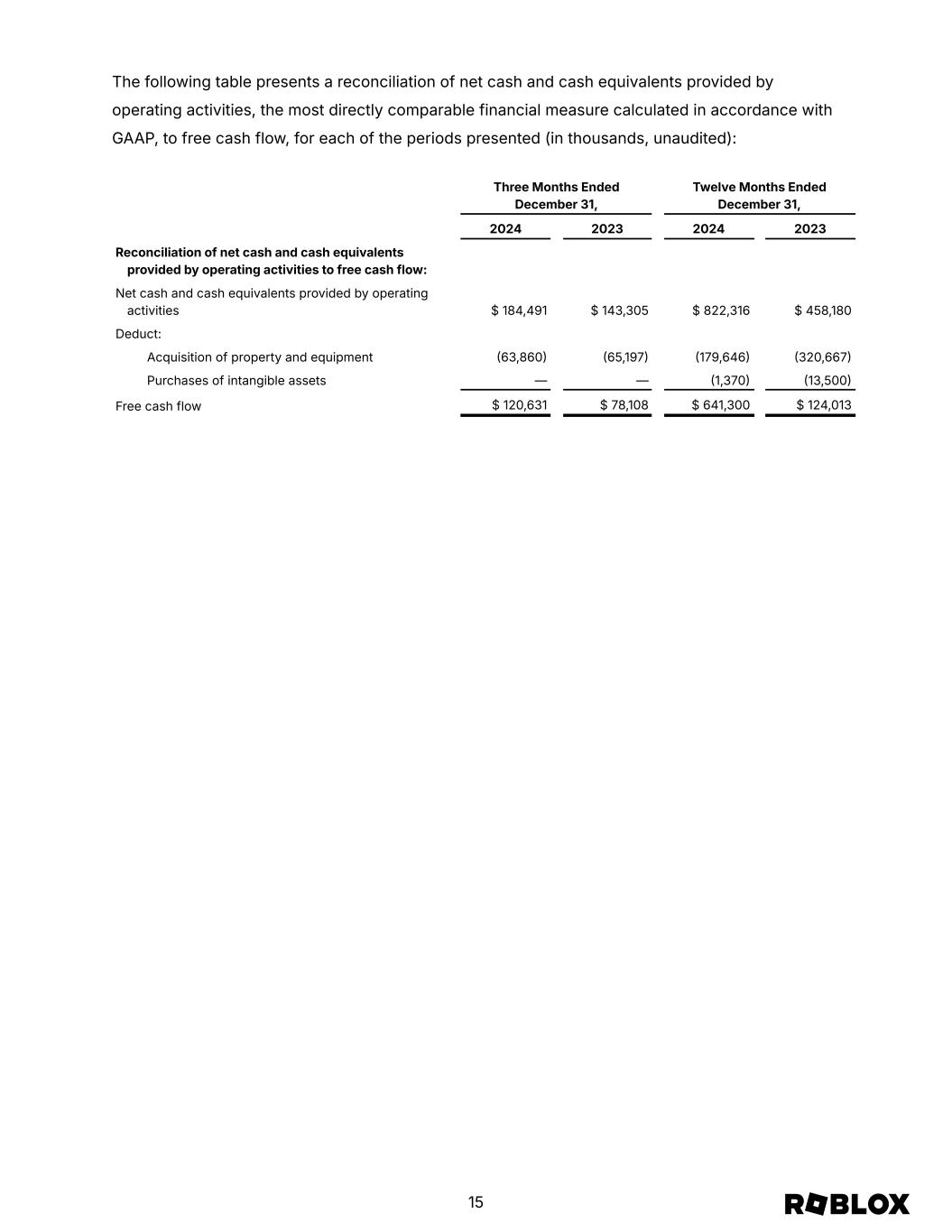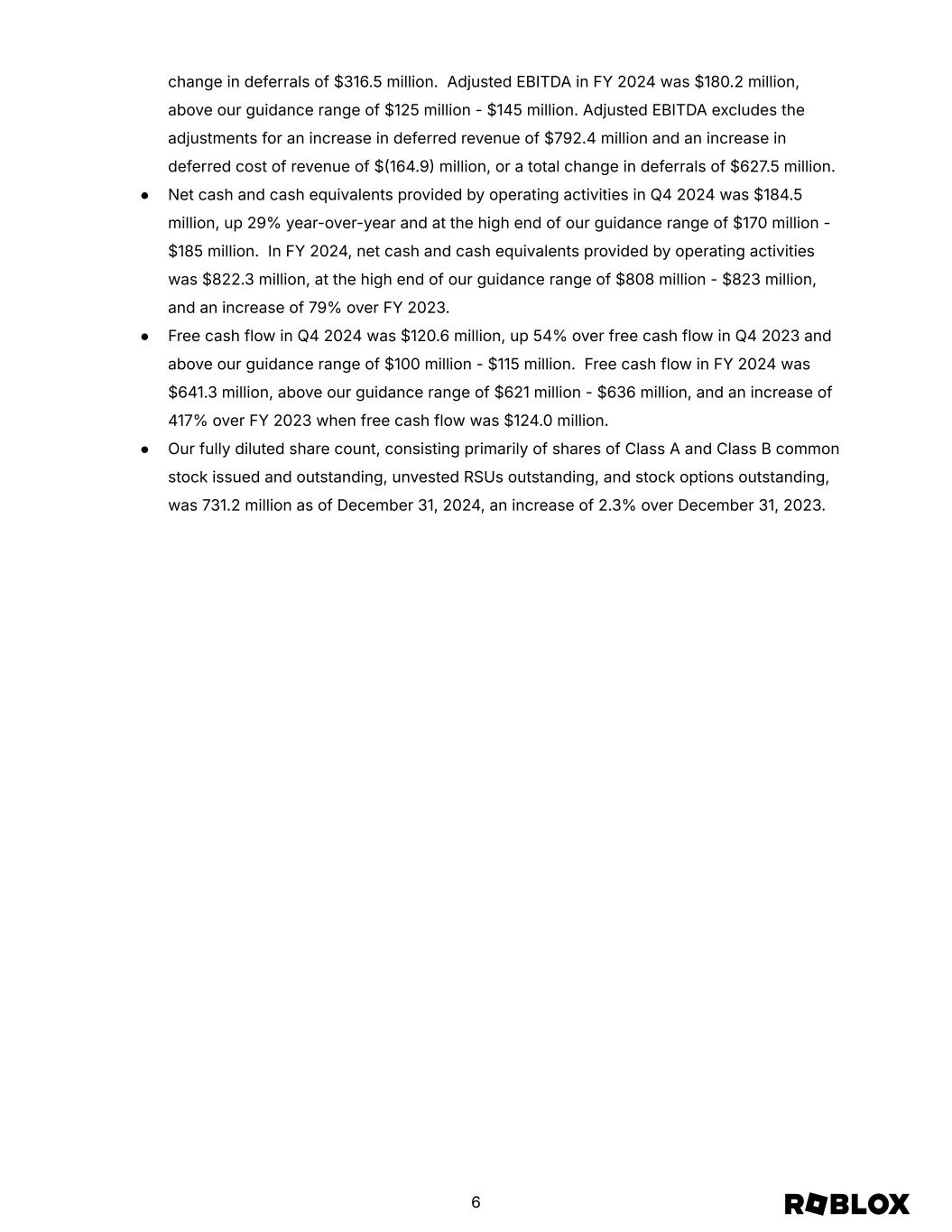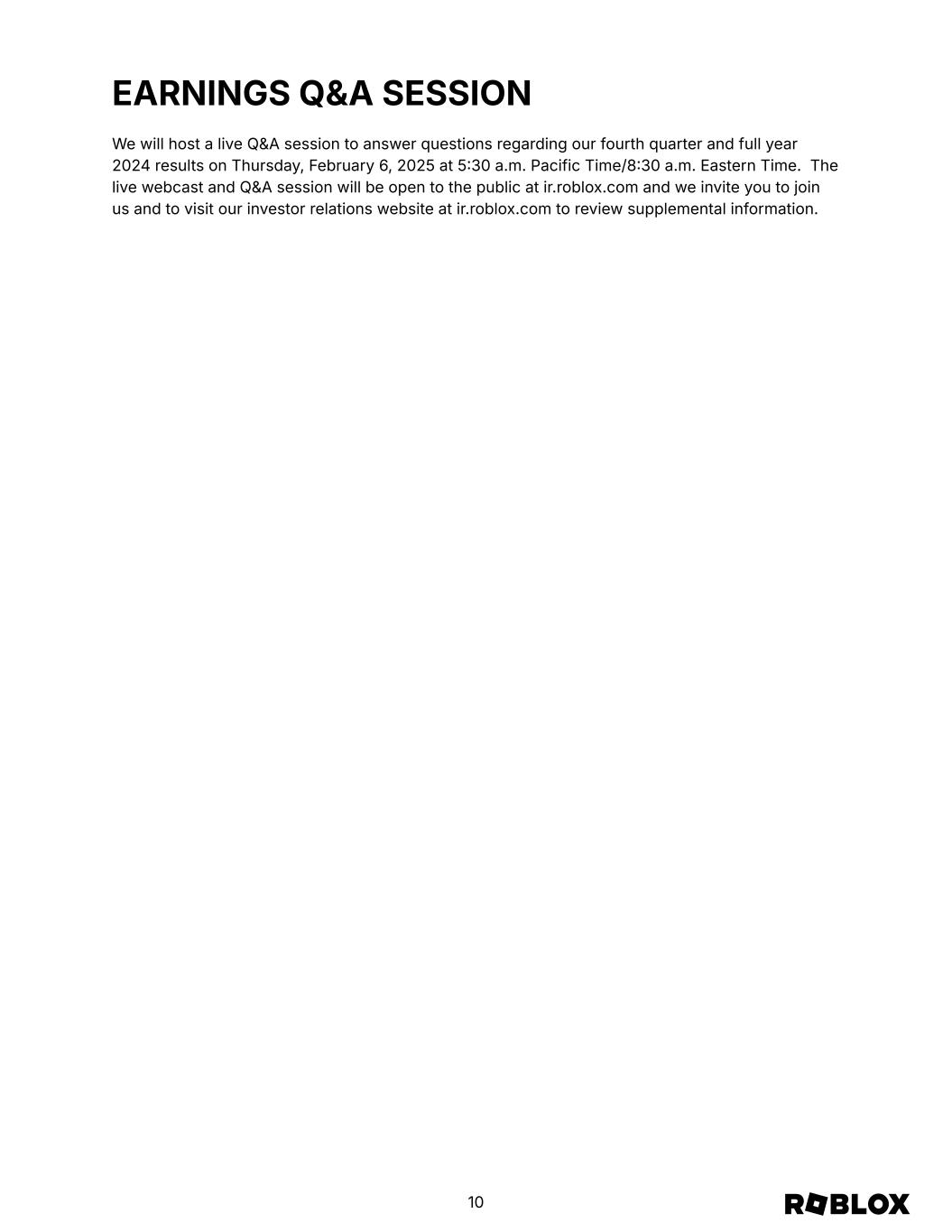 收益问答环节我们将于太平洋时间2025年2月6日(星期四)上午5:30/东部时间上午8:30举办现场问答环节,回答有关我们2024年第四季度和全年业绩的问题。网络直播和问答环节将在ir.roblox.com向公众开放,我们邀请您加入我们,并访问我们的投资者关系网站ir.roblox.com以查看补充信息。10