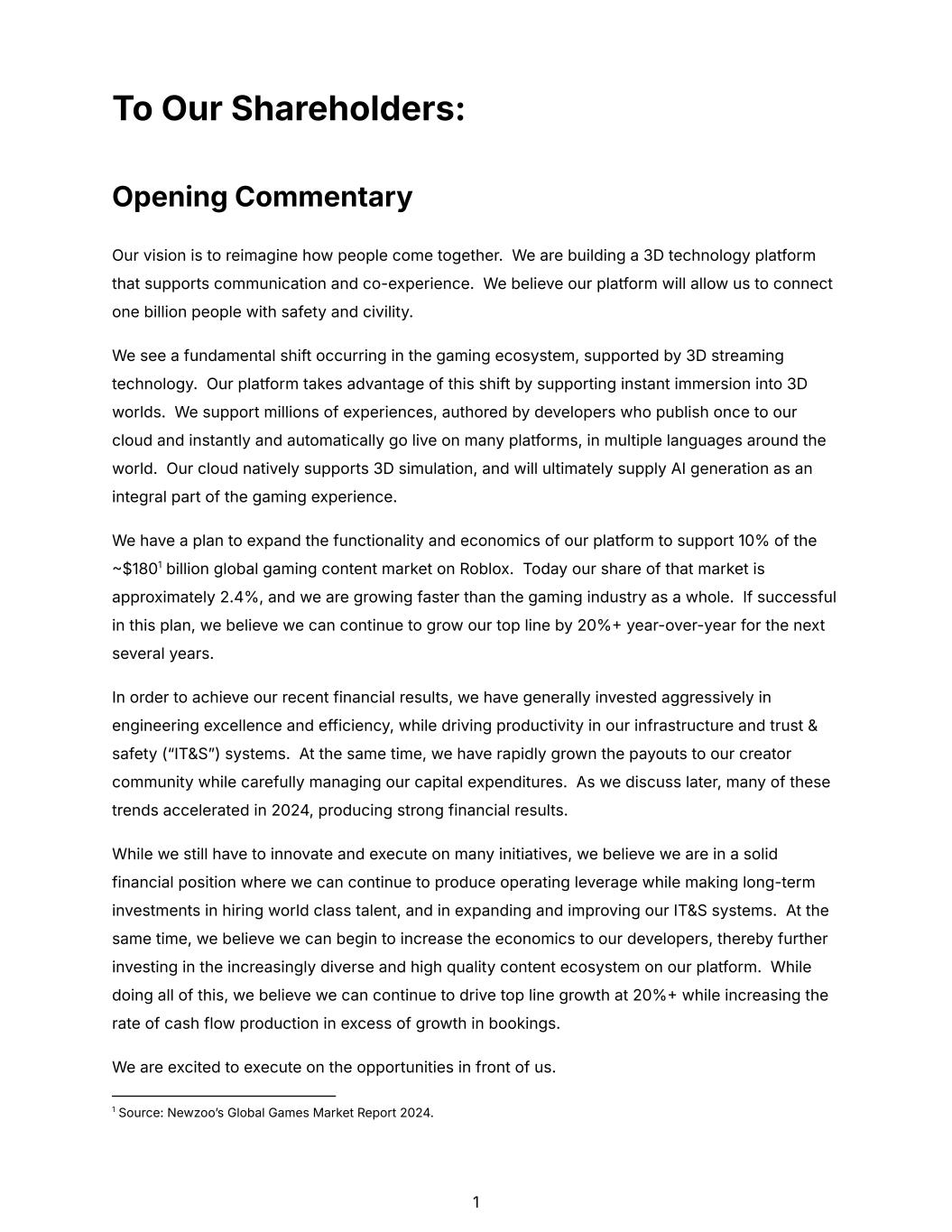 致我们的股东:开篇评论我们的愿景是重新想象人们是如何走到一起的。我们正在构建一个支持交流和共同体验的3D技术平台。我们相信,我们的平台将让我们以安全和文明连接十亿人。我们看到,在3D流媒体技术的支持下,游戏生态系统正在发生根本性转变。我们的平台通过支持即时沉浸在3D世界中来利用这一转变。我们支持数百万种体验,由开发人员编写,他们在我们的云上发布一次,并在世界各地以多种语言在多个平台上即时自动上线。我们的云原生支持3D模拟,最终将提供AI生成作为游戏体验的一个组成部分。我们计划扩展平台的功能和经济性,以支持Roblox上1801亿美元的全球游戏内容市场的10%。今天,我们在该市场的份额约为2.4%,我们的增长速度超过了整个游戏行业。如果这一计划取得成功,我们相信我们可以在未来几年继续使我们的收入同比增长20%。为了实现我们最近的财务业绩,我们通常在工程卓越和效率方面进行了积极投资,同时提高了我们的基础设施和信任与安全(“IT & S丨)系统的生产力。与此同时,我们在谨慎管理资本支出的同时,迅速增加了对创作者社区的支出。正如我们稍后讨论的那样,其中许多趋势在2024年加速发展,产生了强劲的财务业绩。尽管我们仍需在许多举措上进行创新和执行,但我们相信我们的财务状况稳健,我们可以继续产生经营杠杆,同时在招聘世界级人才以及扩大和改进我们的IT & S系统方面进行长期投资。与此同时,我们相信我们可以开始增加对我们的开发者的经济性,从而进一步投资于我们平台上日益多样化和高质量的内容生态系统。在做这一切的同时,我们相信我们可以继续推动收入增长达到20%,同时提高现金流的产生速度,超过预订量的增长。我们很高兴能够执行我们面前的机会。1资料来源:Newzoo的《2024年全球游戏市场报告》。1