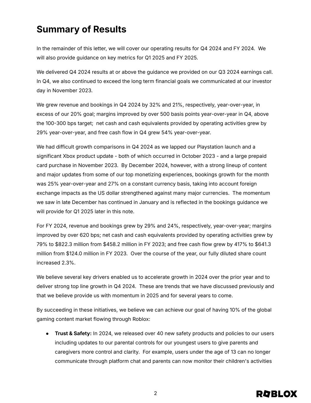 业绩摘要在本函的其余部分,我们将介绍我们2024年第四季度和2024财年的经营业绩。我们还将为2025年第一季度和2025财年的关键指标提供指导。我们交付的2024年第四季度业绩达到或高于我们在2024年第三季度财报电话会议上提供的指导。在第四季度,我们还继续超过了我们在2023年11月投资者日上传达的长期财务目标。我们在2024年第四季度的收入和预订量分别同比增长32%和21%,超过了我们20%的目标;第四季度的利润率同比改善超过500个基点,高于100300个基点的目标;经营活动提供的净现金和现金等价物同比增长29%,第四季度的自由现金流同比增长54%。我们在2024年第四季度进行了艰难的增长比较,因为我们赶上了PlayStation的发布和Xbox产品的重大更新——两者都发生在2023年10月——以及2023年11月的大量预付卡购买。然而,到2024年12月,凭借强大的内容阵容和我们一些顶级货币化体验的重大更新,当月的预订量同比增长25%,按固定汇率计算增长27%,其中考虑到了美元兑许多主要货币走强带来的外汇影响。我们在12月下旬看到的势头在1月份继续保持,并反映在我们将在本说明稍后提供的2025年第一季度的预订指导中。2024财年,收入和预订量分别同比增长29%和24%;利润率提高超620个基点;经营活动提供的净现金和现金等价物从2023财年的4.582亿美元增长79%至8.223亿美元;自由现金流从2023财年的1.24亿美元增长417%至6.413亿美元。在这一年中,我们的完全稀释的股票数量增加了2.3%。我们认为,几个关键驱动因素使我们能够在2024年比上一年加速增长,并在2024年第四季度实现强劲的收入增长。这些是我们之前讨论过的趋势,我们认为这些趋势为我们在2025年和未来几年提供了动力。通过在这些举措上取得成功,我们相信我们可以实现让全球游戏内容市场10%的份额通过Roblox流动的目标:● Trust & Safety:在2024年,我们向用户发布了40多项新的安全产品和政策,包括为最年轻的用户更新了我们的家长控制,以赋予父母和照顾者更多的控制权和清晰度。比如,13岁以下用户不再可以通过平台聊天交流,家长现在可以监控孩子的活动2