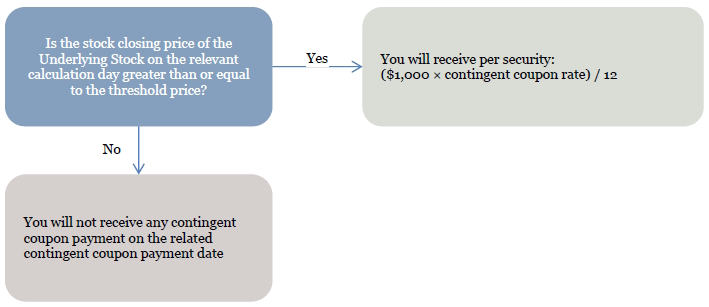 在每个或有息票支付日,当且仅当相关计算日的正股股票收盘价大于或等于阈值价格时,您将收到一笔或有息票支付,年利率等于或有息票利率。每笔“或有息票支付”(如有)将按以下方式计算每笔证券:(1,000美元×或有息票率)/12。任何或有息票支付将被四舍五入到最接近的一分钱,其中二分之一美分向上四舍五入。