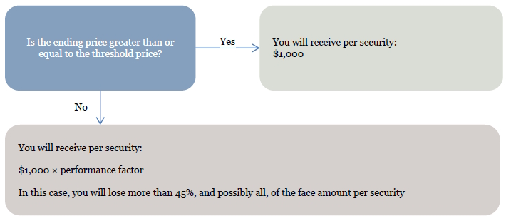 由于假设的期末价格低于假设的起始价格超过45%,您将损失您的证券面值的一部分,并获得相当于每份证券450.00美元的到期付款金额,计算如下: