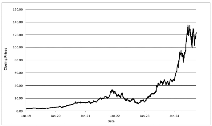 下图列出标的股票在2019年1月1日至2024年9月27日期间的每日收盘价。2024年9月27日收盘价为121.40美元。不应将标的股票的历史表现作为其在证券期限内未来表现的指示。