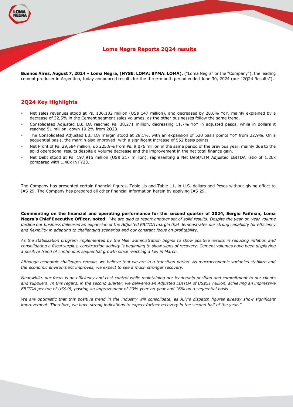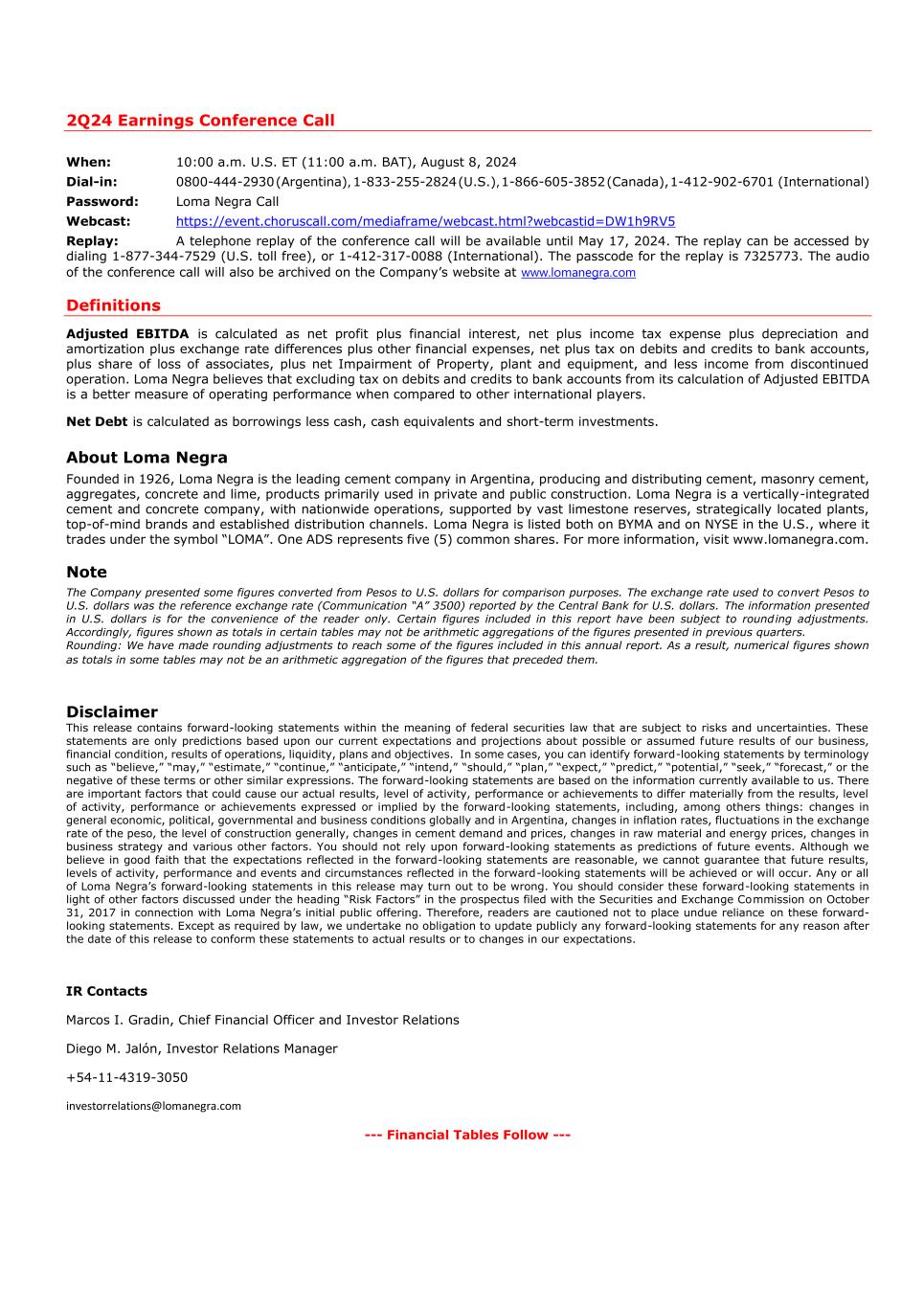 2Q24收益电话会议时间:美国东部时间上午10:00(BAT上午11:00),2024年8月8日拨入:0800-444-2930(阿根廷)、1-833-255-2824(美国)、1-866-605-3852(加拿大)、1-412-902-6701(国际)密码:Loma Negra Call网络直播:https://event.choruscall.com/mediaframe/webcast.html?webcastid=DW1h9RV5重播:电话会议的电话重播将持续到2024年5月17日。重播可拨打1-877-344-7529(美国免费电话),或1-412-317-0088(国际)。重播的密码是7325773。电话会议的音频也将归档在公司网站www.lomanegra.com上。定义调整后的EBITDA计算为净利润加上财务利息,净额加上所得税费用加上折旧和摊销加上汇率差异加上其他财务费用,净额加上银行账户的借方和贷方的税,加上应占联营公司的亏损,加上物业、厂房和设备的净减值,减去终止经营业务的收入。Loma Negra认为,与其他国际参与者相比,将银行账户的借方和贷方的税款排除在其调整后EBITDA的计算之外是衡量经营业绩的更好指标。净债务的计算方法是借款减去现金、现金等价物和短期投资。关于Loma NegraLoma Negra成立于1926年,是阿根廷领先的水泥公司,生产和分销水泥、砖石水泥、骨料、混凝土和石灰,这些产品主要用于私人和公共建筑。Loma Negra是一家垂直一体化水泥和混凝土公司,业务遍及全国,拥有庞大的石灰石储量、战略位置的工厂、顶级品牌和成熟的分销渠道作为支撑。Loma Negra在美国BYMA和纽约证券交易所上市,交易代码为“LOMA”。一份ADS代表五(5)股普通股。欲了解更多信息,请访问www.lomanegra.com。注该公司提供了一些从比索兑换成美元的数字,以供比较。将比索兑换成美元所使用的汇率是央行报告的美元参考汇率(Communication“A”3500)。以美元呈现的信息,仅为方便读者使用。本报告所载的某些数字已作四舍五入调整。因此,某些表格中显示为总数的数字可能不是前几个季度所列数字的算术汇总。四舍五入:我们进行了四舍五入调整,以达到本次年度报告中包含的部分数字。因此,在某些表格中显示为总数的数字数字可能不是它们前面的数字的算术汇总。免责声明本新闻稿包含联邦证券法含义内的前瞻性陈述,这些陈述受到风险和不确定性的影响。这些陈述仅是基于我们当前对我们业务的可能或假设的未来结果、财务状况、运营结果、流动性、计划和目标的预期和预测的预测。在某些情况下,您可以通过诸如“相信”、“可能”、“估计”、“继续”、“预期”、“打算”、“应该”、“计划”、“预期”、“预测”、“潜在”、“寻求”、“预测”或这些术语的否定或其他类似表达等术语来识别前瞻性陈述。这些前瞻性陈述基于我们目前可获得的信息。有一些重要因素可能导致我们的实际结果、活动水平、业绩或成就与前瞻性陈述中明示或暗示的结果、活动水平、业绩或成就存在重大差异,其中包括:全球和阿根廷总体经济、政治、政府和商业状况的变化、通货膨胀率的变化、比索汇率的波动、总体建筑水平、水泥需求和价格的变化、原材料和能源价格的变化、商业战略的变化以及各种其他因素。你不应该依赖前瞻性陈述作为对未来事件的预测。尽管我们真诚地相信前瞻性陈述中反映的预期是合理的,但我们不能保证前瞻性陈述中反映的未来结果、活动水平、业绩以及事件和情况将会实现或将会发生。Loma Negra在本新闻稿中的任何或所有前瞻性陈述可能被证明是错误的。您应该结合2017年10月31日向美国证券交易委员会提交的招股说明书中“风险因素”标题下讨论的其他因素来考虑这些前瞻性陈述,这些因素与Loma Negra的首次公开募股有关。因此, 读者被告诫不要过分依赖这些前瞻性陈述。除法律要求外,我们不承担在本新闻稿发布之日后以任何理由公开更新任何前瞻性陈述的义务,以使这些陈述符合实际结果或我们预期的变化。IR联系人Marcos I. Gradin,首席财务官和投资者关系Diego M. Jal ó n,投资者关系经理+ 54-11-4319-3050investorrelations@lomanegra.com---财务表格如下---