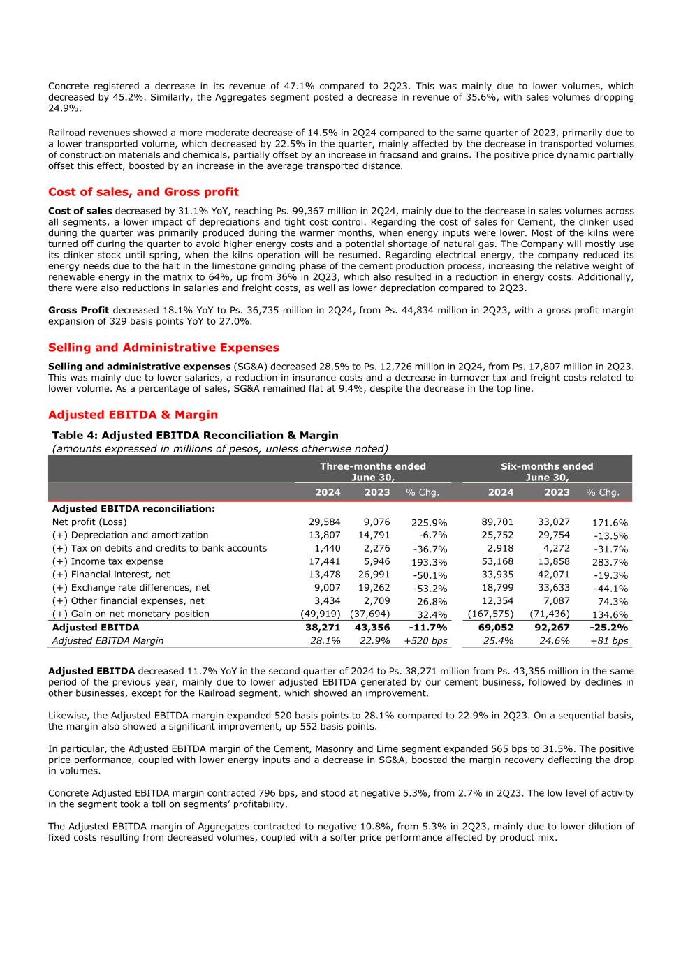 Concrete收入较2Q23减少47.1%。这主要是由于销量下降,销量下降了45.2%。同样,骨料部门的收入下降了35.6%,销量下降了24.9%。与2023年同季度相比,铁路收入在2Q24出现了14.5%的较为温和的下降,主要是由于运输量减少,该季度减少了22.5%,主要受建筑材料和化学品运输量减少的影响,部分被压裂砂和谷物的增加所抵消。受平均运输距离增加的提振,积极的价格动态部分抵消了这一影响。销售成本、毛利销售成本同比下降31.1%,达PS。2Q24的993.67亿,主要是由于所有细分市场的销量下降、折旧的影响较低以及成本控制从紧。关于水泥的销售成本,本季度使用的熟料主要是在温暖的月份生产的,当时能源投入较低。大多数窑炉在本季度关闭,以避免更高的能源成本和潜在的天然气短缺。该公司将大部分使用其熟料库存,直到春季,届时将恢复窑炉运营。关于电能,由于水泥生产过程的石灰石研磨阶段停止,公司减少了能源需求,将可再生能源在矩阵中的相对权重从2Q23的36%提高到64%,这也导致能源成本下降。此外,与2Q23相比,工资和运费也有所减少,折旧也有所减少。毛利同比下降18.1%至PS。2Q24的367.35亿,来自PS。2Q23为448.34亿,毛利率同比扩大329个基点至27.0%。销售和管理费用销售和管理费用(SG & A)下降28.5%至PS。2Q24的127.26亿,来自PS。2Q23为178.07亿。这主要是由于工资下降、保险费用减少以及与销量下降相关的流转税和运费成本下降。SG & A占销售额的百分比持平于9.4%,尽管收入有所下降。调整后EBITDA &利润率表4:调整后EBITDA调节&利润率(金额以百万比索表示,除非另有说明)截至6月30日的三个月,截至2024年6月30日的六个月2023年chg。20242023% CHG。调整后EBITDA调节:净利润(亏损)29,5849,076225.9% 89,70133,027171.6%(+)折旧和摊销13,80714,791-6.7 % 25,75229,754-13.5 %(+)银行账户的借方和贷方税1,4402,276-36.7 % 2,9184,272-31.7 %(+)所得税费用17,4415,946193.3% 53,16813,858283.7%(+)财务利息净额13,47826,991-50.1 % 33,93542,071-19.3 %(+)汇率差额净额9,00719,262-53.2 % 18,79933,633-44.1 %(+)其他财务费用,净额3,4342,70926.8% 12,3547,08774.3%(+)净货币头寸收益(49,919)(37,694)32.4%(167,575)(71,436)134.6%调整后EBITDA 38,27143,356-11.7 % 69,05292,267-25.2 %调整后EBITDA利润率28.1% 22.9% + 520个基点25.4% 24.6% + 81个基点调整后EBITDA在2024年第二季度同比下降11.7%至PS。382.71亿来自PS。上年同期43,356百万,主要是由于我们的水泥业务产生的经调整EBITDA较低,其次是其他业务的下降,除了铁路分部显示有所改善。同样,调整后EBITDA利润率扩大520个基点至28.1%,而23年第二季度为22.9%。环比来看,利润率也出现了明显改善,上升了552个基点。特别是水泥、砖石和石灰部门的调整后EBITDA利润率扩大565个基点至31.5%。积极的价格表现,加上能源投入减少和SG & A减少,推动了利润率回升,抵消了销量下降的影响。混凝土调整后EBITDA利润率收缩796个基点,为负5.3%,而23年第二季度为2.7%。该细分市场的低活动水平对细分市场的盈利能力造成了影响。骨料的调整后EBITDA利润率从2Q23的5.3%收缩至负10.8%,这主要是由于销量下降导致的固定成本减少,加上受产品组合影响的价格表现疲软。