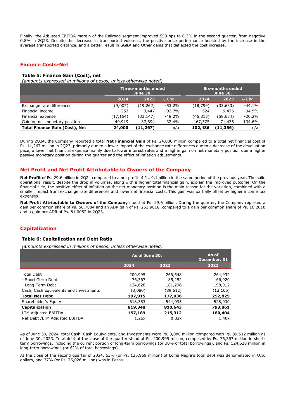 最后,第二季度铁路部门的调整后EBITDA利润率从2Q23的负0.8%提高553个基点至6.3%。尽管运输量有所下降,但由于平均运输距离的增加,积极的价格表现得到提振,更好的结果是SG & A和其他收益转移了成本增长。财务成本-净额表5:财务收益(成本),净额(金额以百万比索表示,除非另有说明)截至6月30日的三个月,截至2024年6月30日的六个月2023% CHG。20242023% CHG。汇差(9,007)(19,262)-53.2 %(18,799)(33,633)-44.1 %财务收入2533,447-92.7 % 5249,476-94.5 %财务费用(17,164)(33,147)-48.2 %(46,813)(58,634)-20.2 %净货币头寸收益49,91937,69432.4% 167,5771,436134.6%总财务收益(成本)净额24,000(11,267)n/a 102,486(11,356)n/a在2Q24期间,公司报告的总净财务收益为PS。2.4亿,而PS的总净财务成本。2Q23为1126.7亿,主要是由于贬值速度降低导致汇率差异影响较小,主要由于利率下降导致净财务费用降低,以及由于本季度较高的被动货币头寸以及通胀调整的影响导致净货币头寸收益增加。净利润及归属于公司所有者的净利润PS。2Q24净利润296亿对比PS。上年同期91亿。尽管销量下降,但稳健的运营结果,以及更高的总财务收益,解释了改善的结果。在财务方面,通胀对净货币头寸的正面影响是差异的主要原因,再加上汇率差异和净财务成本较低的影响较小。这一收益被较高的所得税费用部分抵消。归属于公司所有者的净利润为PS。296亿。本季度,该公司报告每股普通股P收益。50.7804,ADR收益PS。253.9018,而每股普通股收益为PS。16.2010和每股ADR收益为PS。2Q23为81.0052。资本化情况表6:资本化和负债率(金额以百万比索表示,除非另有说明)截至6月30日,截至12月31日202420232023总债务200,995266,548264,932-短期债务76,36785,25266,920-长期债务124,628181,296198,0 12现金、现金等价物和投资(3,080)(89,512)(12,106)总净债务197,915177,036252,825股东权益618,353544,095528,930资本化819,348810,643793,861 LTM调整后EBITDA 157,189215,312180,404净债务/LTM调整后EBITDA 1.26x 0.82x 1.40x截至2024年6月30日,现金、现金等价物总额,与PS相比为30.08亿。截至2023年6月30日为895.12亿。本季度末的总债务为PS。2009.95亿,PS组成。短期借款763.67亿,包括长期借款的流动部分(或借款总额的38%),以及PS。长期借款1.24628亿(占总借款的62%)。在2024年第二季度末,63%(或PS。1.25969亿)的Loma Negra总债务以美元计价,37%(或Ps。7502.6万比索)。