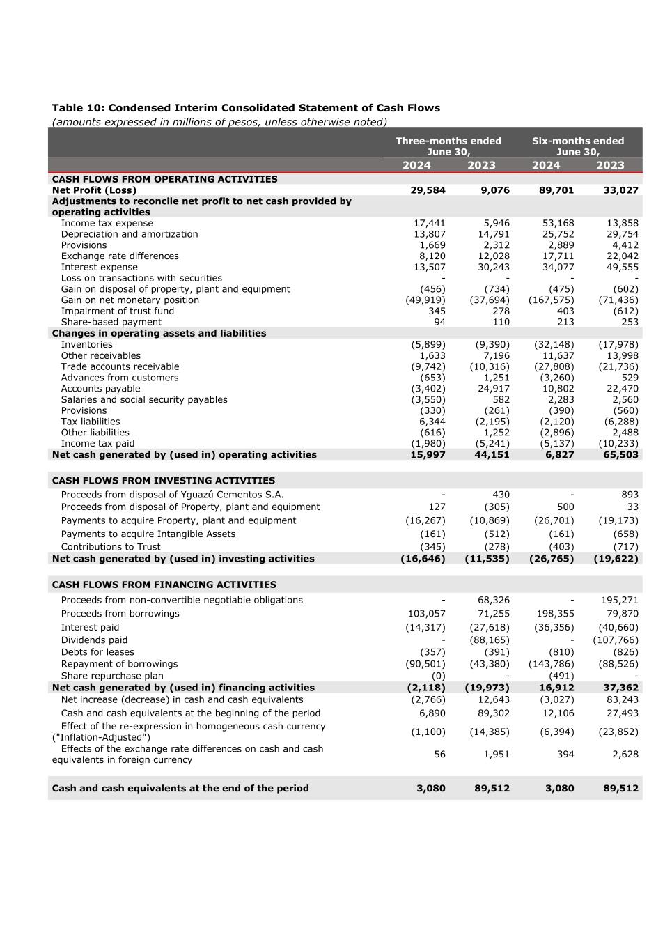 表10:简明中期综合现金流量表(金额以百万比索表示,除非另有说明)截至6月30日止三个月、截至6月30日止六个月,2024202320242023经营活动产生的现金流量净利润(亏损)29,5849,07689,70133,027调整净利润与经营活动提供的现金净额所得税费用17,4415,94653,16813,858折旧和摊销13,80714,79125,75229,754拨备1,6692,3122,8894,412汇率差异8,12012,02817,71122,042利息费用13,50730,24334,07749,555有价证券交易损失----处置财产收益,厂房及设备(456)(734)(475)(602)货币净头寸收益(49,919)(37,694)(167,575)(71,436)信托基金减值345278403(612)股份支付94110213253经营资产及负债变动存货(5,899)(9,390)(32,148)(17,978)其他应收款1,6337,19611,63713,998应收贸易账款(9,742)(10,316)(27,808)(21,736)客户垫款(653)1,251(3,260)529应付账款(3,402)24,91710,80222,470薪金应付社保(3,550)5822,2832,560拨备(330)(261)(390)(560)税项负债6,344(2,195)(2,120)(6,288)其他负债(616)1,252(2,896)2,488已缴纳所得税(1,980)(5,241)(5,137)(10,233)经营活动产生(用于)的现金净额15,99744,1516,82765,503投资活动产生的现金流量处置Yguaz ú Cementos S.A.的收益-430-893处置物业、厂房和设备的收益127(305)50033收购物业的付款,植物和设备(16,267)(10,869)(26,701)(19,173)收购无形资产的款项(161)(512)(161)(658)信托出资(345)(278)(403)(717)投资活动产生(用于)的现金净额(16,646)(11,535)(26,765)(19,622)融资活动产生的现金流量不可转换可转让债务收益-68,326-195,271借款收益103,05771,255198,35579,870已付利息(14,317)(27,618)(36,356)(40,660)支付股利-(88,165)-(107,766)债务用于租赁(357)(391)(810)(826)偿还借款(90,501)(43,380)(143,786)(88,526)股份回购计划(0)-(491)-筹资活动产生(用于)的现金净额(2,118)(19,973)16,91237,362现金及现金等价物净增加(减少)(2,766)12,643(3,027)83,243期初现金及现金等价物6,89089,30212,10627,493以同质现金货币重新表示的影响(“经通胀调整后”)(1,100)(14,385)(6,394)(23,852)汇率差异对外币现金及现金等价物的影响561,9513942,628现金期末现金等价物3,08089,5123,08089,512