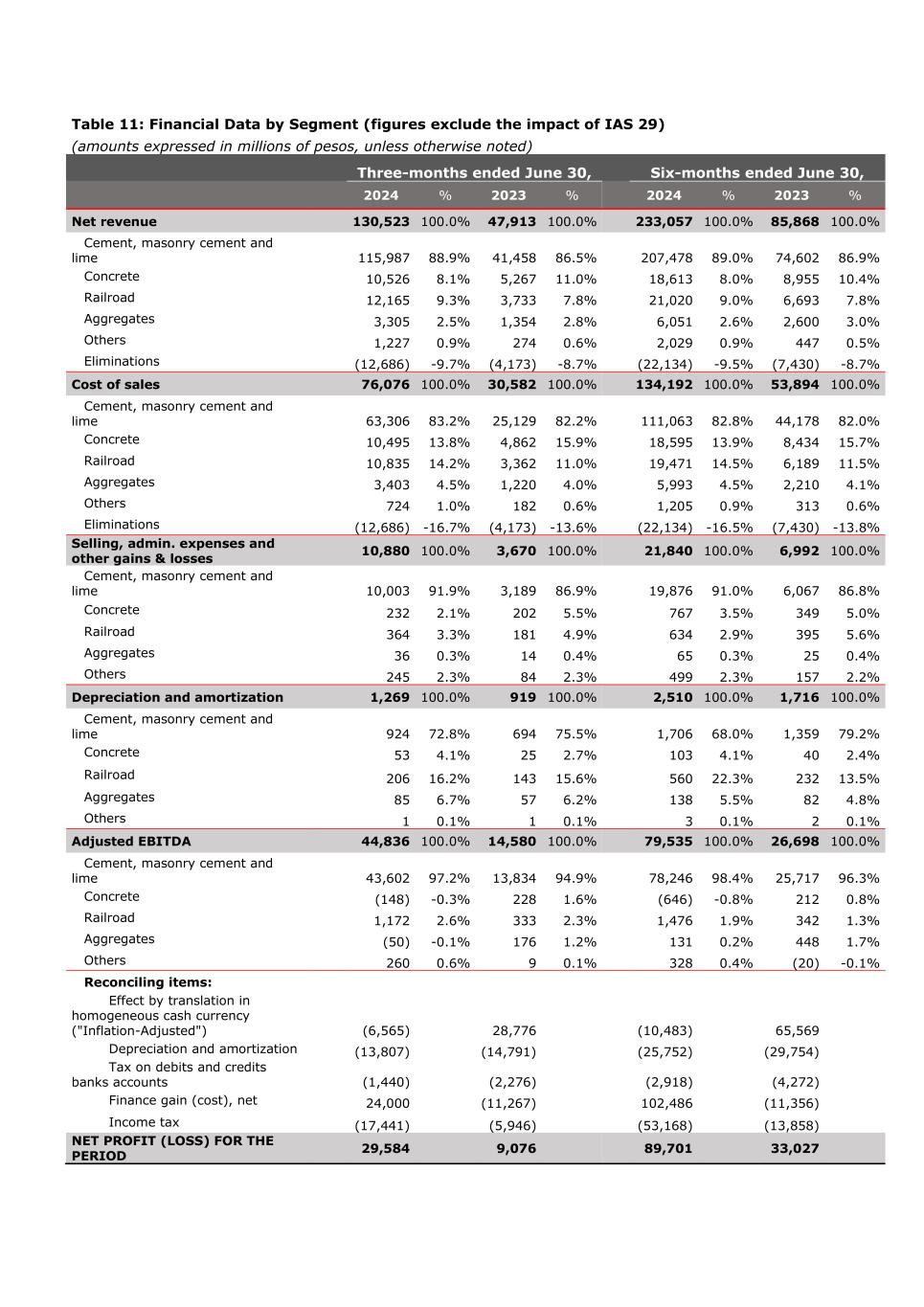 表11:按分部划分的财务数据(数字不包括IAS 29的影响)(金额以百万比索表示,除非另有说明)截至6月30日止三个月、截至6月30日止六个月、2024% 2023% 2024% 2023%净营收130,523100.0% 47,913100.0% 233,057100.0% 85,868100.0%水泥,砖石水泥及石灰115,98788.9% 41,45886.5% 207,47889.0% 74,60286.9%混凝土10,5268.1% 5,26711.0% 18,6138.0% 8,95510.4%铁路12,1659.3% 3,7337.8% 21,0 209.0% 6,6937.8%骨料3,3052.5% 1,3542.8% 6,0512.6% 2,600.0%其他1,2270.9% 2740.6% 2,0290.9% 4470.5%消除(12,686)-9.7 %(4,173)-8.7 %(22,134)-9.5 %(7,430)-8.7 %销售成本76,076100.0% 30,582 100.0% 134,192100.0% 53,894100.0%水泥,砖石水泥及石灰63,30683.2% 25,12982.2% 111,0638 2.8% 44,1788 2.0%混凝土10,49513.8% 4,86215.9% 18,59513.9% 8,43415.7%铁路10,83514.2% 3,36211.0% 19,47114.5% 6,18911.5%骨料3,4034.5% 1,2204.0% 5,9934.5% 2,2104.1%其他7241.0% 1820.6% 1,2050.9% 3130.6%消除(12,686)-16.7 %(4,173)-13.6 %(22,134)-16.5 %(7,430)-13.8 %销售、管理费用及其他损益10,880100.0% 3,670100.0% 21,840100.0% 6,992100.0%水泥,砖石水泥及石灰10,00391.9% 3,18986.9% 19,87691.0% 6,06786.8%混凝土2322.1% 2025.5% 7673.5% 3495.0%铁路3643.3% 1814.9% 6342.9% 3955.6%骨料36 0.3% 140.4% 65 0.3% 250.4%其他2452.3% 842.3% 4992.3% 1572.2%折旧摊销1,269100.0% 919100.0% 2,510100.0% 1,716100.0%水泥,砖石水泥及石灰92472.8% 69475.5% 1,70668.0% 1,35979.2%混凝土534.1% 252.7% 1034.1% 402.4%铁路20616.2% 14315.6% 56022.3% 23213.5%骨料856.7% 576.2% 1385.5% 824.8%其他10.1% 30.1% 20.1%调整后EBITDA 44,836100.0% 14,580100.0% 79,535100.0% 26,698100.0%水泥,砖石水泥及石灰43,60297.2% 13,83494.9% 78,24698.4% 25,71796.3%混凝土(148)-0.3 % 2281.6%(646)-0.8 % 2120.8%铁路1,1722.6% 333 2.3% 1,4761.9% 3421.3%骨料(50)-0.1 % 1761.2% 13 10.2% 4481.7%其他2600.6% 90.1% 32 80.4%(20)-0.1 %调节项目:以同质现金货币换算的影响(“通货膨胀调整后”)(6,565)28,776(10,483)65,569折旧和摊销(13,807)(14,791)(25,752)(29,754)银行账户借方和贷方税(1,440)(2,276)(2,918)(4,272)财务收益(净额24,000(11,267)102,486(11,356)所得税(17,441)(5,946)(53,168)(13,858)本期净利润(亏损)29,5849,07689,70133,027
