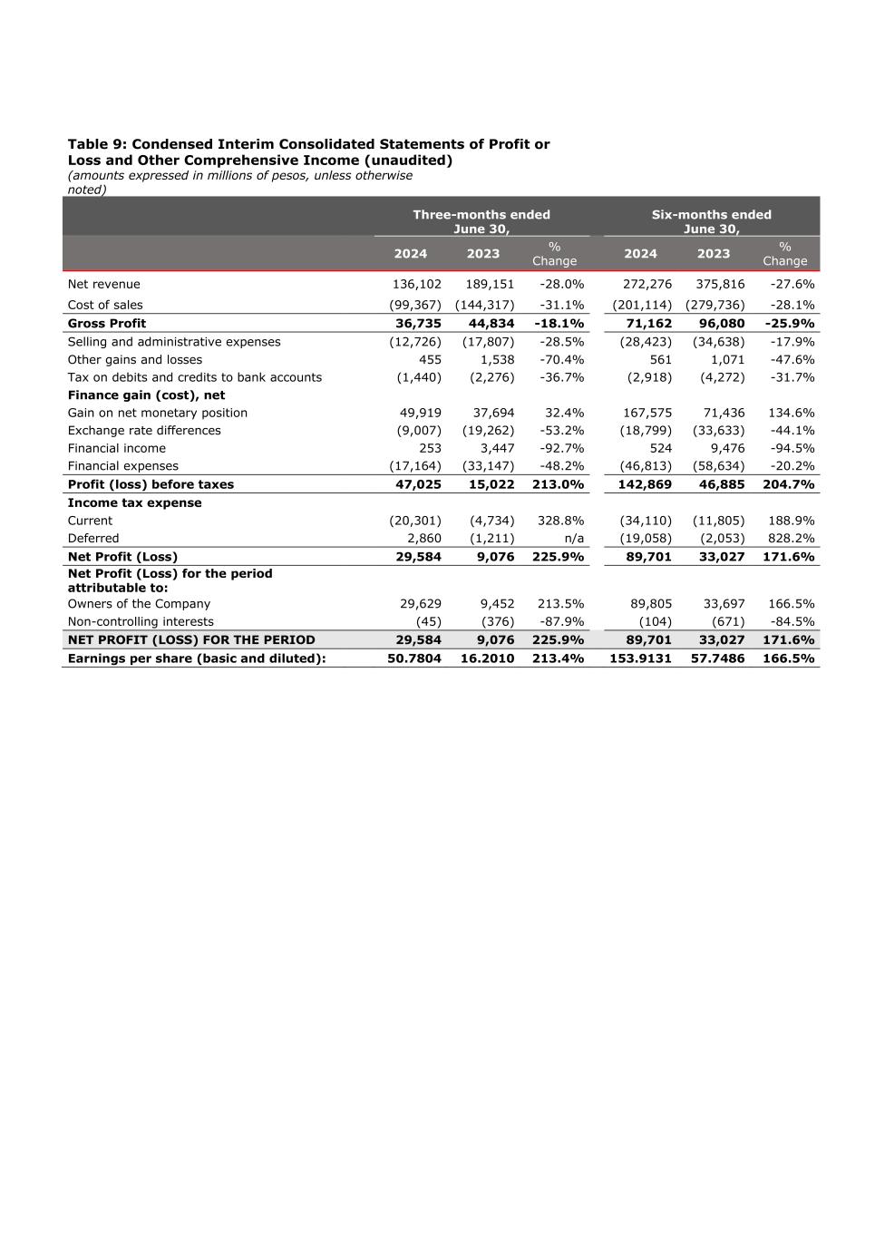 表9:简明中期综合损益表及其他综合收益表(未经审计)(金额以百万比索表示,除非另有说明)截至6月30日止三个月,截至6月30日止六个月,20242023%变动20242023%变动净营收136,102189,151-28.0 % 272,276375,816-27.6 %销售成本(99,367)(144,317)-31.1 %(201,114)(279,736)-28.1 %毛利36,73544,834-18.1 % 71,16296,080-25.9 %销售及管理费用(12,726)(17,807)-28.5 %(28,423)(34,638)-17.9 %其他损益4551,538-70.4 % 5611,071-47.6 %银行账户借方及贷方税(1,440)(2,276)-36.7 %(2,918)(4,272)-31.7 %财务收益(成本),净货币头寸净收益49,91937,69432.4% 167,57571,436134.6%汇率差(9,007)(19,262)-53.2 %(18,799)(33,633)-44.1 %财务收入2533,447-92.7 % 5249,476-94.5 %财务费用(17,164)(33,147)-48.2 %(46,813)(58,634)-20.2 %税前利润(亏损)47,02515,022213.0% 142,86946,885204.7%所得税费用当期(20,301)(4,734)328.8%(34,110)(11,805)188.9%递延2,860(1,211)不适用(19,058)(2,053)828.2%净利润(亏损)29,5849,归属于:公司拥有人29,6299,452213.5% 89,80533,697166.5%非控股权益(45)(376)-87.9 %(104)(671)-84.5 %期内净利润(亏损)29,5849,076225.9% 89,70133,027171.6%每股收益(基本及摊薄):50.780416.20 10213.4% 153.9 13157.7 486166.5%