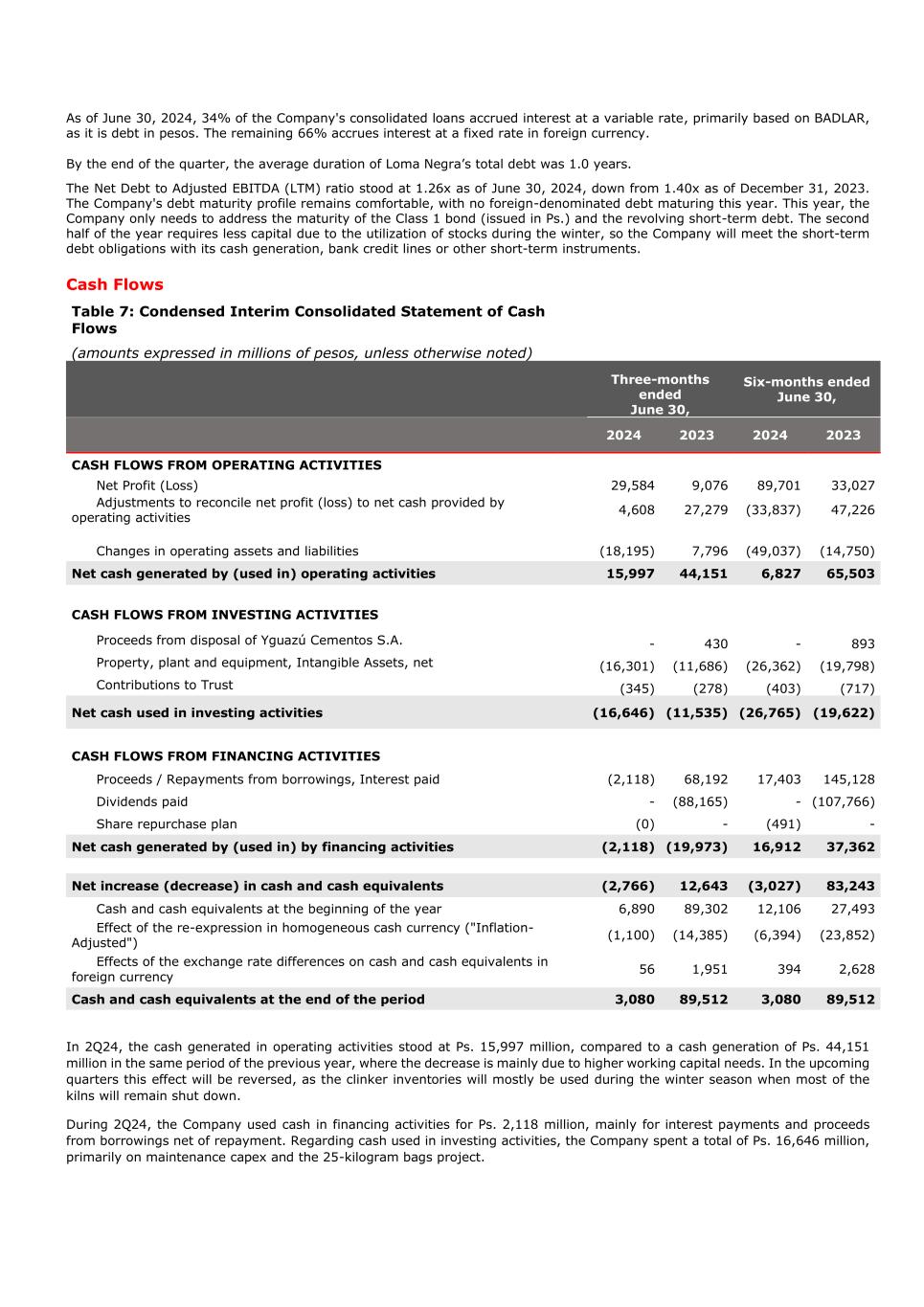 截至2024年6月30日,公司合并贷款的34%以浮动利率计息,主要基于BADLAR,因为它是比索债务。其余66%按外币固定利率计息。截至本季度末,Loma Negra总债务的平均期限为1.0年。截至2024年6月30日,净债务与调整后EBITDA(LTM)的比率为1.26倍,低于截至2023年12月31日的1.40倍。该公司的债务到期情况仍然舒适,今年没有外国计价债务到期。今年,该公司只需解决到期的第1类债券(以PS发行)和循环短期债务。下半年由于冬季利用库存所需资金较少,因此公司将以现金生成、银行授信额度或其他短期工具来满足短期债务义务。现金流量表7:简明中期综合现金流量表(金额以百万比索表示,除非另有说明)截至6月30日的三个月,截至6月30日的六个月,2024202320242023经营活动产生的现金流量净利润(亏损)29,5849,07689,70133,027调整净利润(亏损)与经营活动提供的现金净额4,60827,279(33,837)47,226经营资产和负债变动(18,195)7,796(49,037)(14,750)经营活动产生(用于)的现金净额15,99744,1516,82765,503投资活动产生的现金流量处置Yguaz ú Cementos S.A.的收益-430-893物业、厂房和设备、无形资产,净额(16,301)(11,686)(26,362)(19,798)信托出资(345)(278)(403)(717)投资活动使用的现金净额(16,646)(11,535)(26,765)(19,622)筹资活动产生的现金流量收益/偿还借款,已付利息(2,118)68,19217,403145,128已付股息-(88,165)-(107,766)股份回购计划(0)-(491)-筹资活动产生(用于)的现金净额(2,118)(19,973)16,91237,362现金及现金等价物净增加(减少)数(2,766)12,643(3,027)83,243现金及现金等价物年初数6,89089,30212,10627,493以同质现金货币重新表示的影响(“通货膨胀调整后”)(1,100)(14,385)(6,394)(23,852)汇率差异对外币现金及现金等价物的影响561,9513942,628现金期末现金等价物3,08089,5123,08089,5122Q24经营活动产生的现金为PS。15,997百万,对比现金生成PS。上年同期441.51亿,其中减少主要是由于营运资金需求增加。在接下来的几个季度中,这种影响将被扭转,因为熟料库存将主要用于冬季,届时大部分窑炉将保持停窑状态。2Q24期间,公司将现金用于PS的融资活动。21.18亿,主要用于支付利息及借款收益净额偿还。关于投资活动使用的现金,公司共支出PS。166.46亿,主要用于维护资本支出和25公斤袋项目。