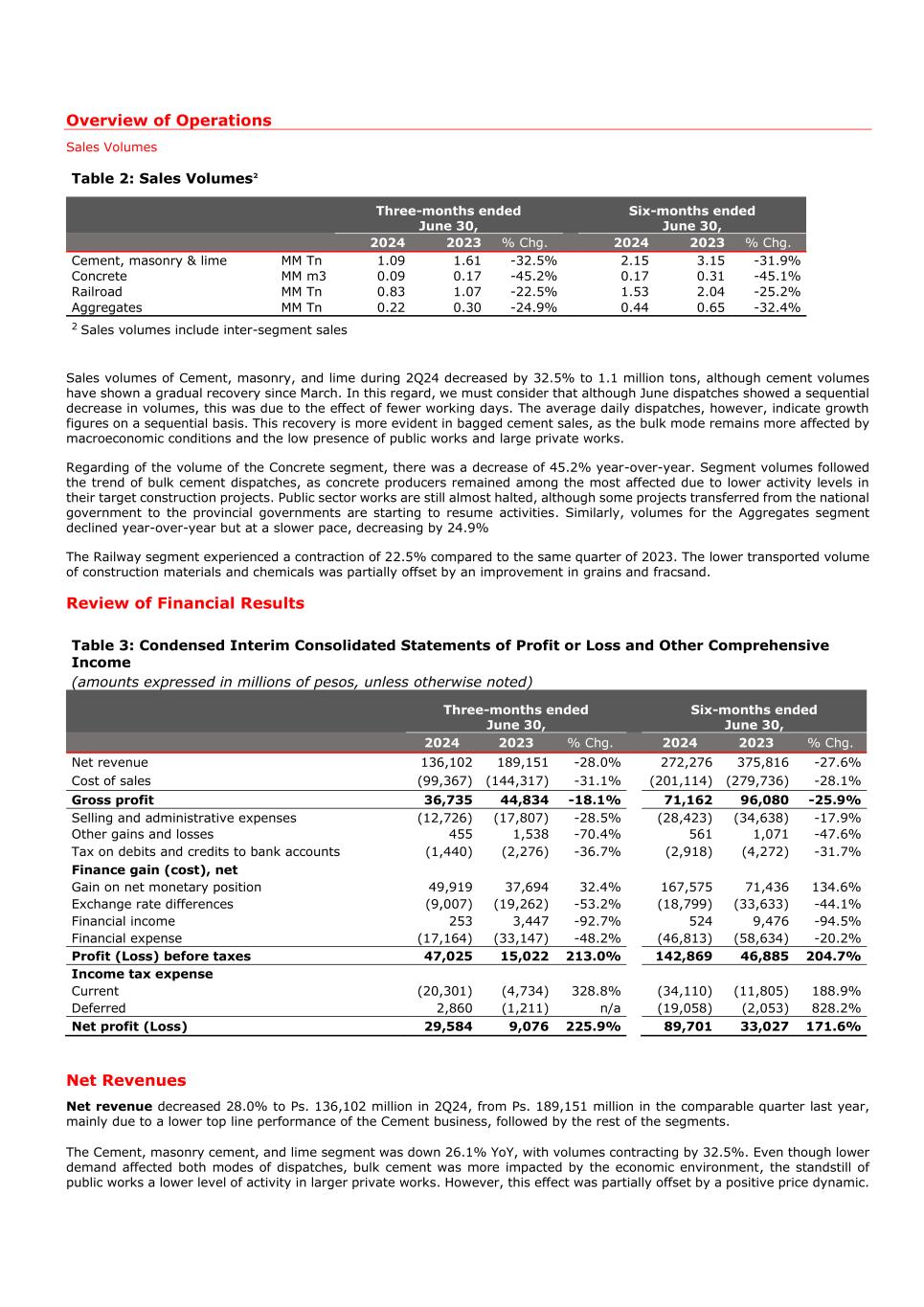 经营业务销量总览表2:销量2截至6月30日止三个月、截至2024年6月30日止六个月2023% CHG。20242023%氯化萘。水泥、砖石&石灰MM TN 1.09 1.61-32.5 % 2.15 3.15-31.9 %混凝土MM m3 0.09 0.17-45.2 % 0.17 0.31-45.1 %铁路MM TN 0.83 1.07-22.5 % 1.53 2.04-25.2 %骨料MM TN 0.22 0.30-24.9 % 0.44 0.65-32.4 % 2销量包括2Q24水泥、砖石、石灰的分部间销量下降32.5%至110万吨,尽管自3月以来水泥量呈现逐步恢复的趋势。对此,我们必须考虑到,虽然6月派件呈现出环比减少的数量,但这是由于工作日减少的影响。然而,日均发送量表明了连续增长的数字。这种复苏在袋装水泥销售中更为明显,因为大宗模式仍然更多地受到宏观经济状况以及公共工程和大型私人工程的低存在的影响。有关混凝土分部的货量则按年下跌45.2%。分部销量跟随散装水泥调度的趋势,因为混凝土生产商的目标建筑项目活动水平较低,因此受到的影响仍然最大。公共部门的工程仍然几乎停止,尽管一些从国家政府转移到省级政府的项目正在开始恢复活动。同样,骨料部分的运量同比下降,但速度放缓,下降了24.9%。与2023年同季度相比,铁路部分收缩了22.5%。建筑材料和化学品运输量的下降被谷物和碎砂的改善部分抵消。财务业绩回顾表3:简明中期综合损益表及其他全面收益(金额以百万比索表示,除非另有说明)截至6月30日止三个月、截至2024年6月30日止六个月2023% CHG。20242023% CHG。净营收136,102189,151-28.0 % 272,276375,816-27.6 %销售成本(99,367)(144,317)-31.1 %(201,114)(279,736)-28.1 %毛利36,73544,834-18.1 % 71,16296,080-25.9 %销售及管理费用(12,726)(17,807)-28.5 %(28,423)(34,638)-17.9 %其他损益4551,538-70.4 % 5611,071-47.6 %银行账户的借方和贷方税(1,440)(2,276)-36.7 %(2,918)(4,272)-31.7 %财务收益(成本),净货币头寸净收益49,91937,69432.4% 167,57571,436134.6%汇率差(9,007)(19,262)-53.2 %(18,799)(33,633)-44.1 %财务收入2533,447-92.7 % 5249,476-94.5 %财务费用(17,164)(33,147)-48.2 %(46,813)(58,634)-20.2 %税前利润(亏损)47,02515,022213.0% 142,86946,885204.7%所得税费用当期(20,301)(4,734)328.8%(34,110)(11,805)188.9%递延2,860(1,211)不适用(19,058)(2,053)828.2%净利润(亏损)29,5849,2Q24的136,102百万,来自PS。去年可比季度1.89 151亿,主要是由于水泥业务的收入表现较低,其次是其余分部。水泥、砖石水泥、石灰板块同比下降26.1%,销量收缩32.5%。即使较低的需求影响了两种调度模式,散装水泥更多地受到经济环境的影响,公共工程的停滞较大的私人工程的活动水平较低。然而,这一影响被积极的价格动态部分抵消。