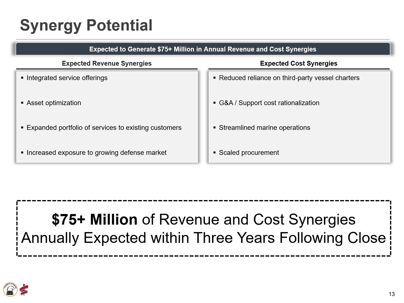预计 产生稳固的收入和成本协同效应:该交易预计将在交易完成后的三年内产生7500万美元或更多的年度收入和成本协同效应。预计协同效应将来自组合和集成服务产品,以及扩大向现有客户提供的服务,从而推动收入拉动。合并后公司船队的规模能够实现资产优化,减少对第三方租船的依赖,并在维护、采购和运营方面提供效率。