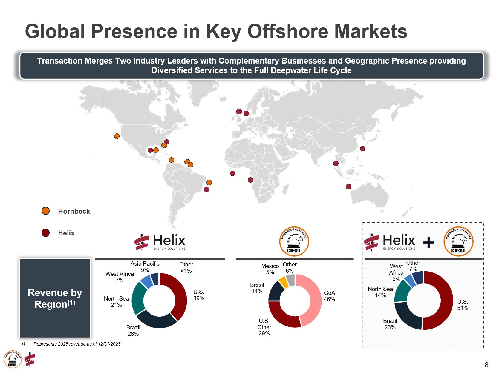 通过在关键离岸市场的强大敞口扩大全球影响力:Helix在西非、亚太和北海地区以及美国和巴西的全球存在,以及Hornbeck在包括巴西和墨西哥在内的美洲的集中,增强了跨越全球关键近海盆地的全球足迹。合并后的公司足迹将包括受海岸保护的市场,并将直接接触领先的海上客户,从而能够通过技术先进的资产提供一流的深水服务。