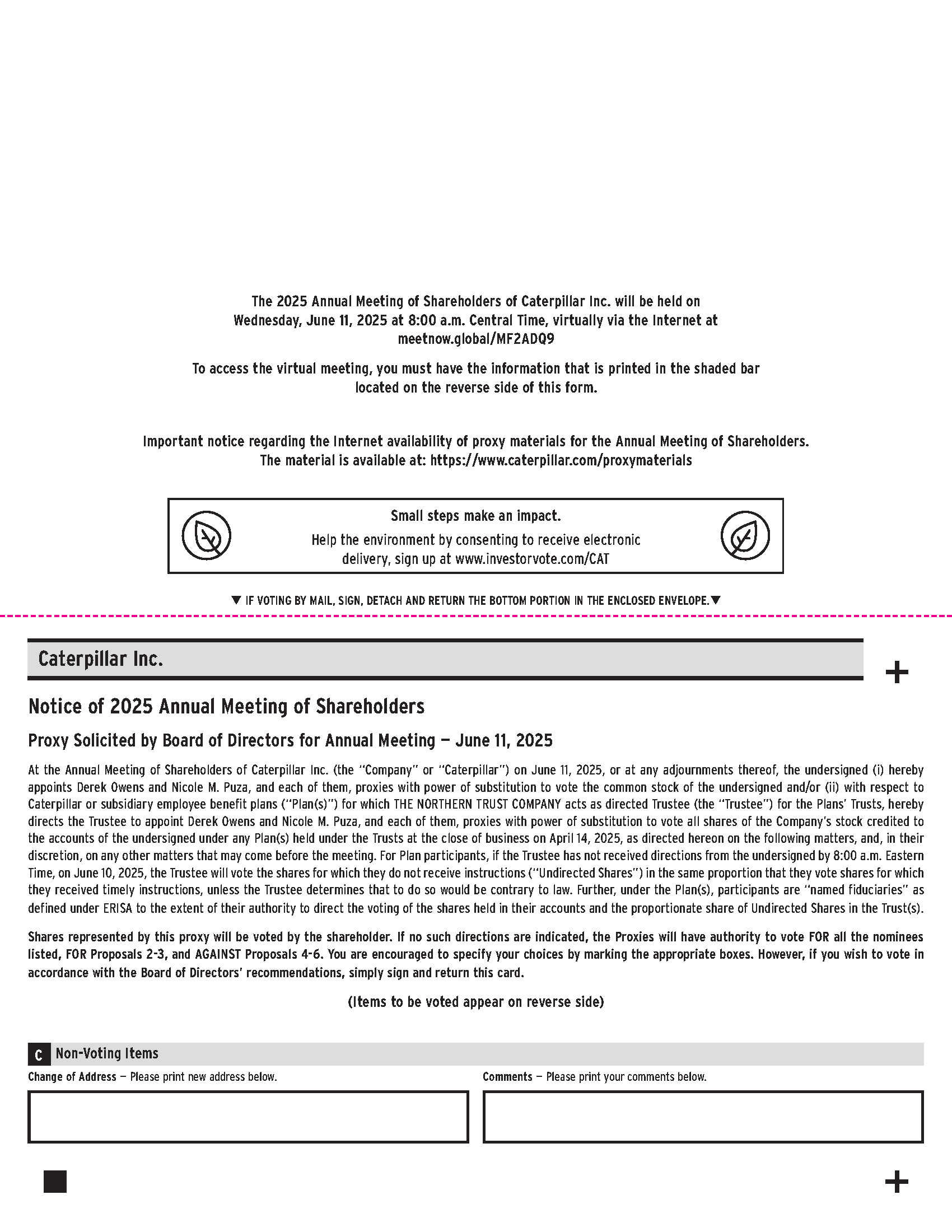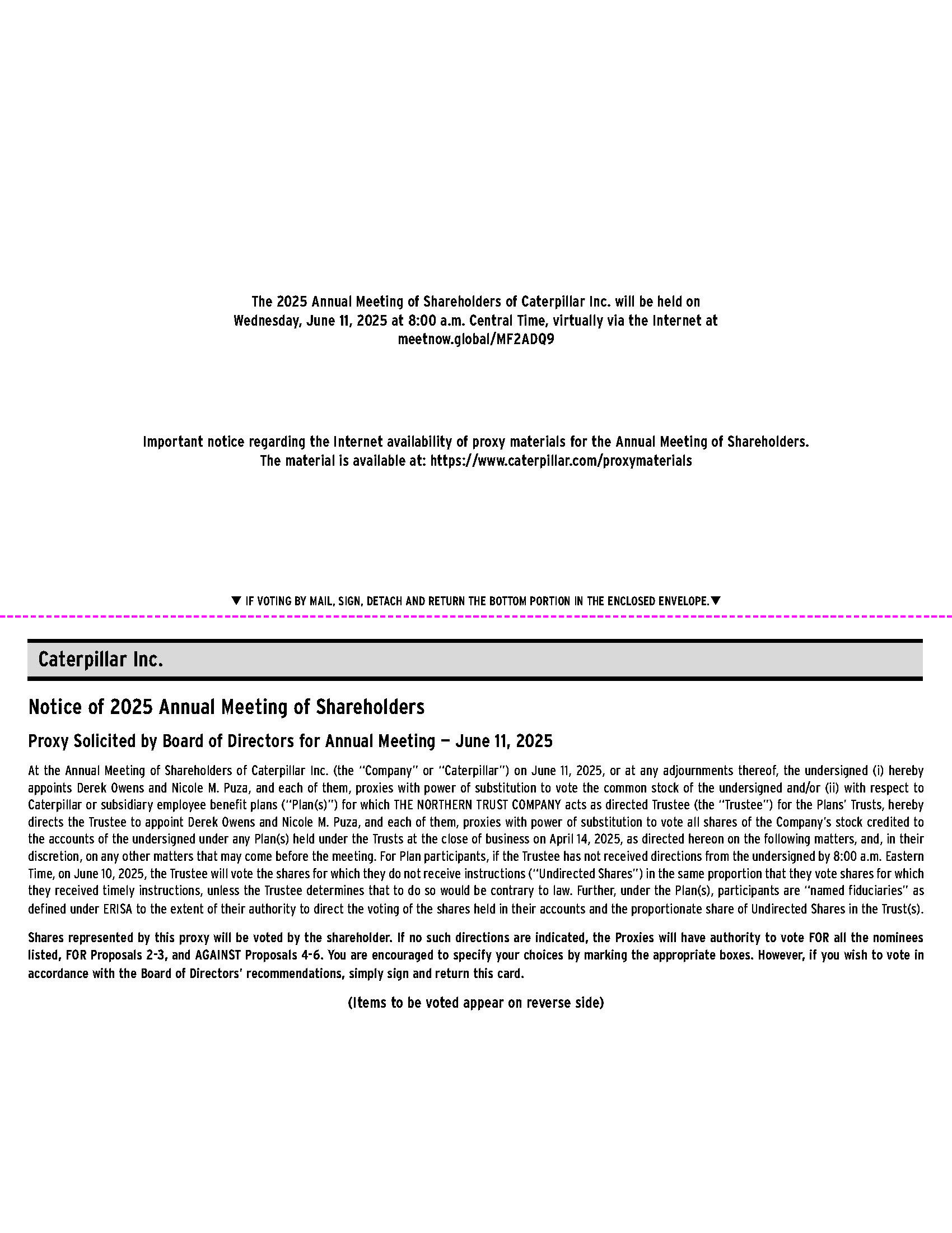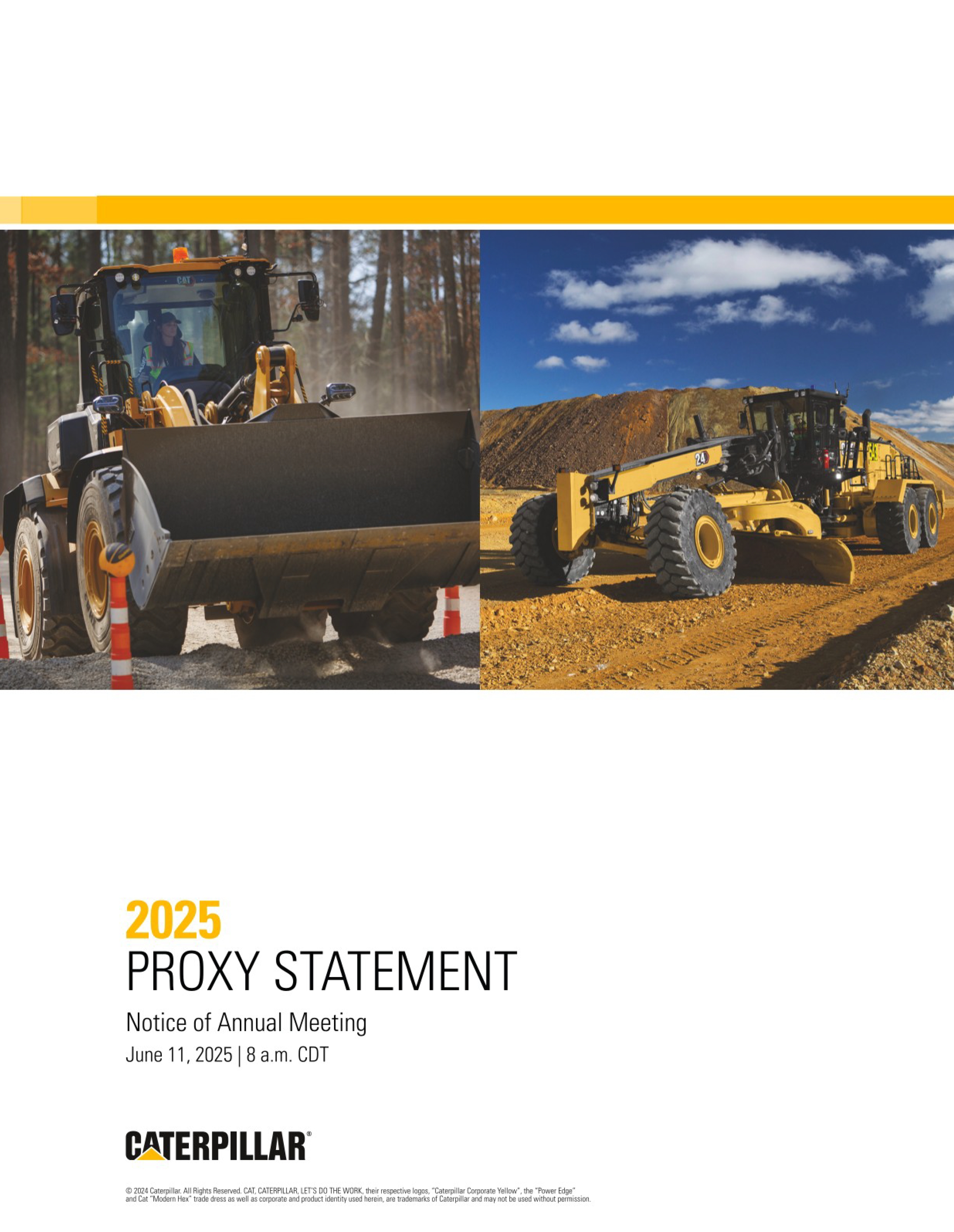 我们向您发送这些与卡特彼勒代表其董事会为2025年年度股东大会(年会)征集代理有关的代理材料。这些物资计划于2025年5月1日开始分发。请您通过电话、移动设备、互联网提交投票或代理,或者,如果您通过邮寄方式收到材料,您可以通过邮寄方式填写并交回您的代理或投票指示表。