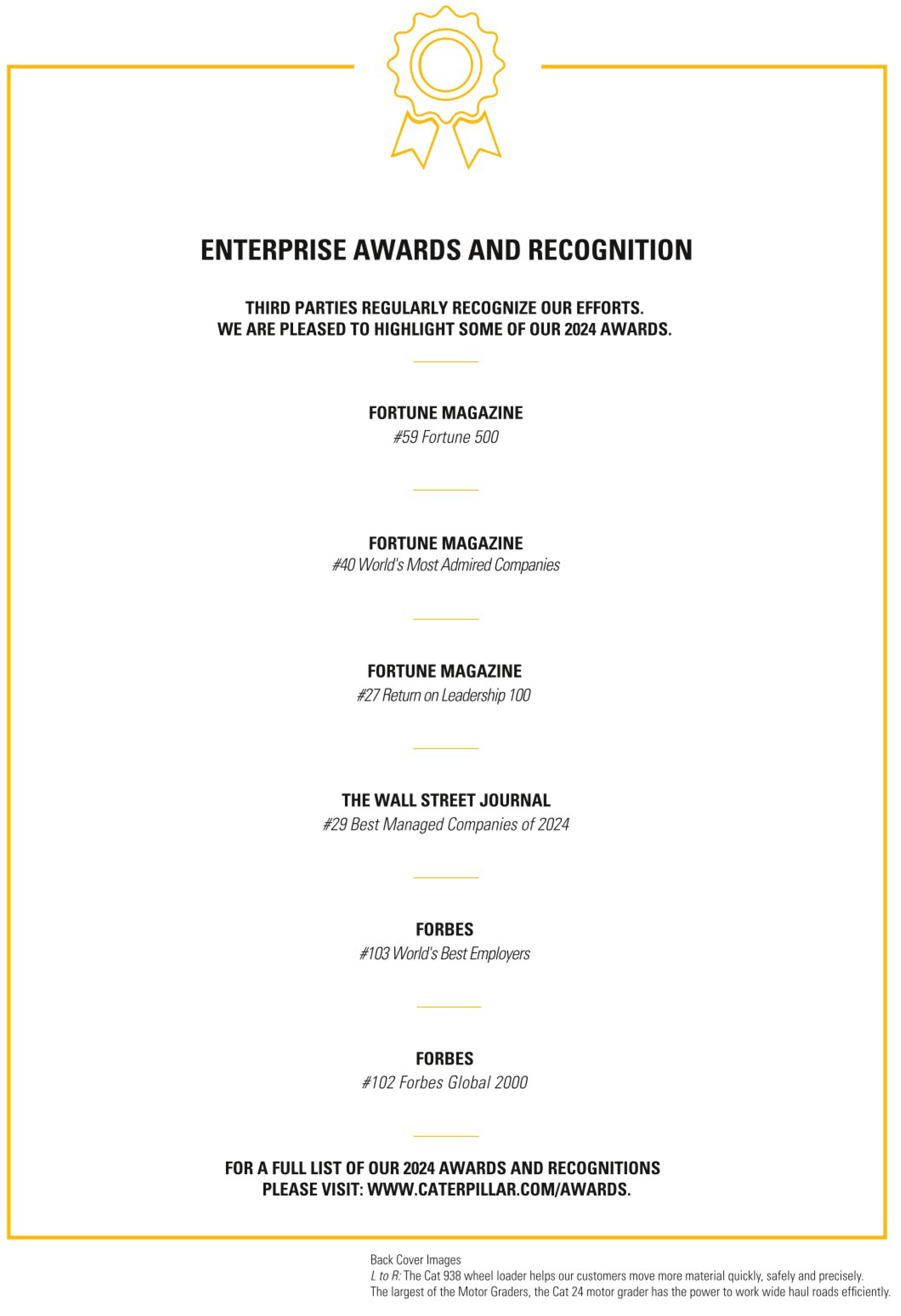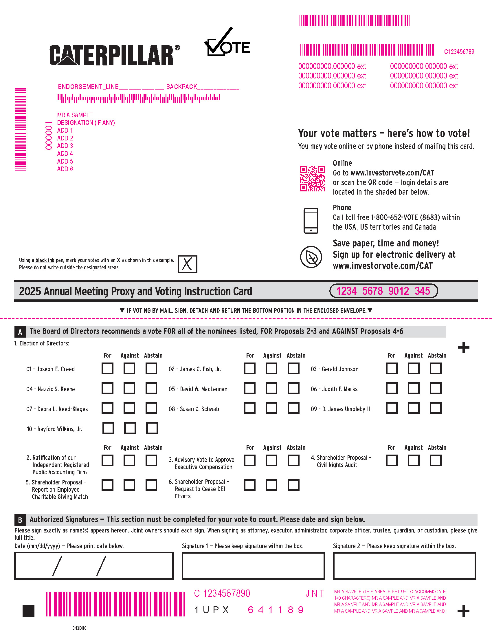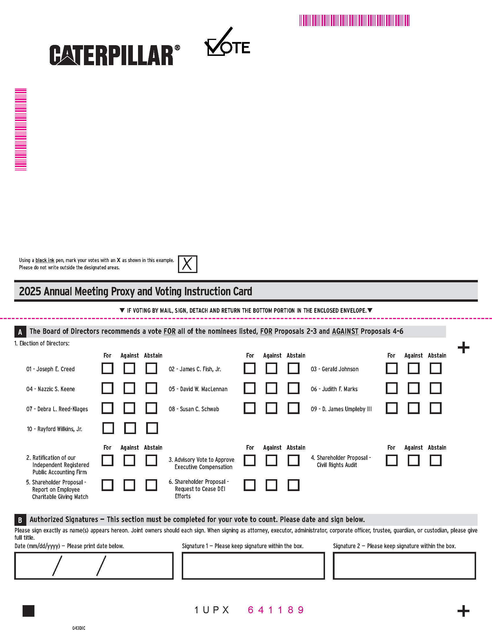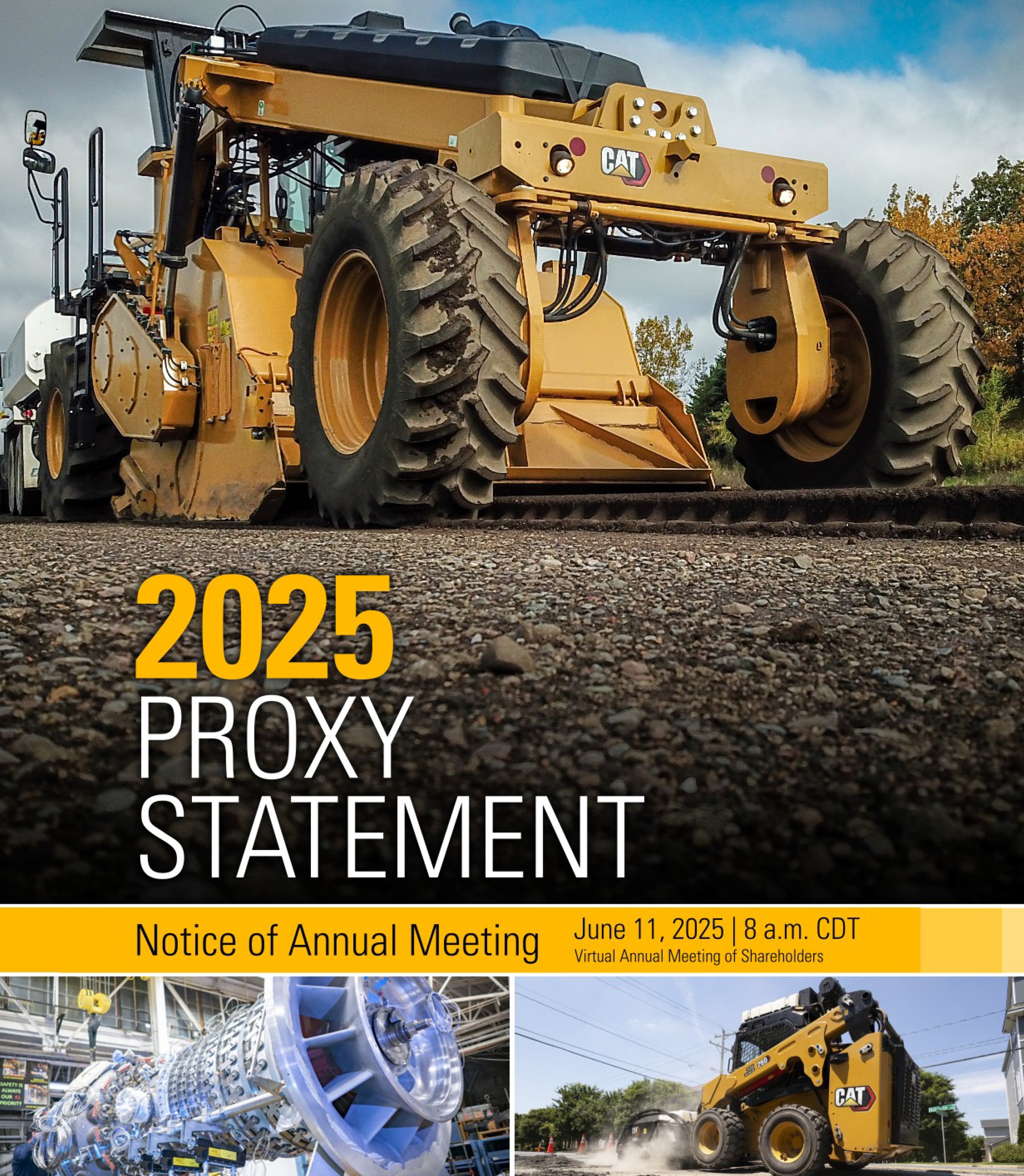 我们向您发送这些与卡特彼勒代表其董事会为2025年年度股东大会(年会)征集代理有关的代理材料。这些物资计划于2025年5月1日开始分发。请您通过电话、移动设备、互联网提交投票或代理,或者,如果您通过邮寄方式收到材料,您可以通过邮寄方式填写并交回您的代理或投票指示表。