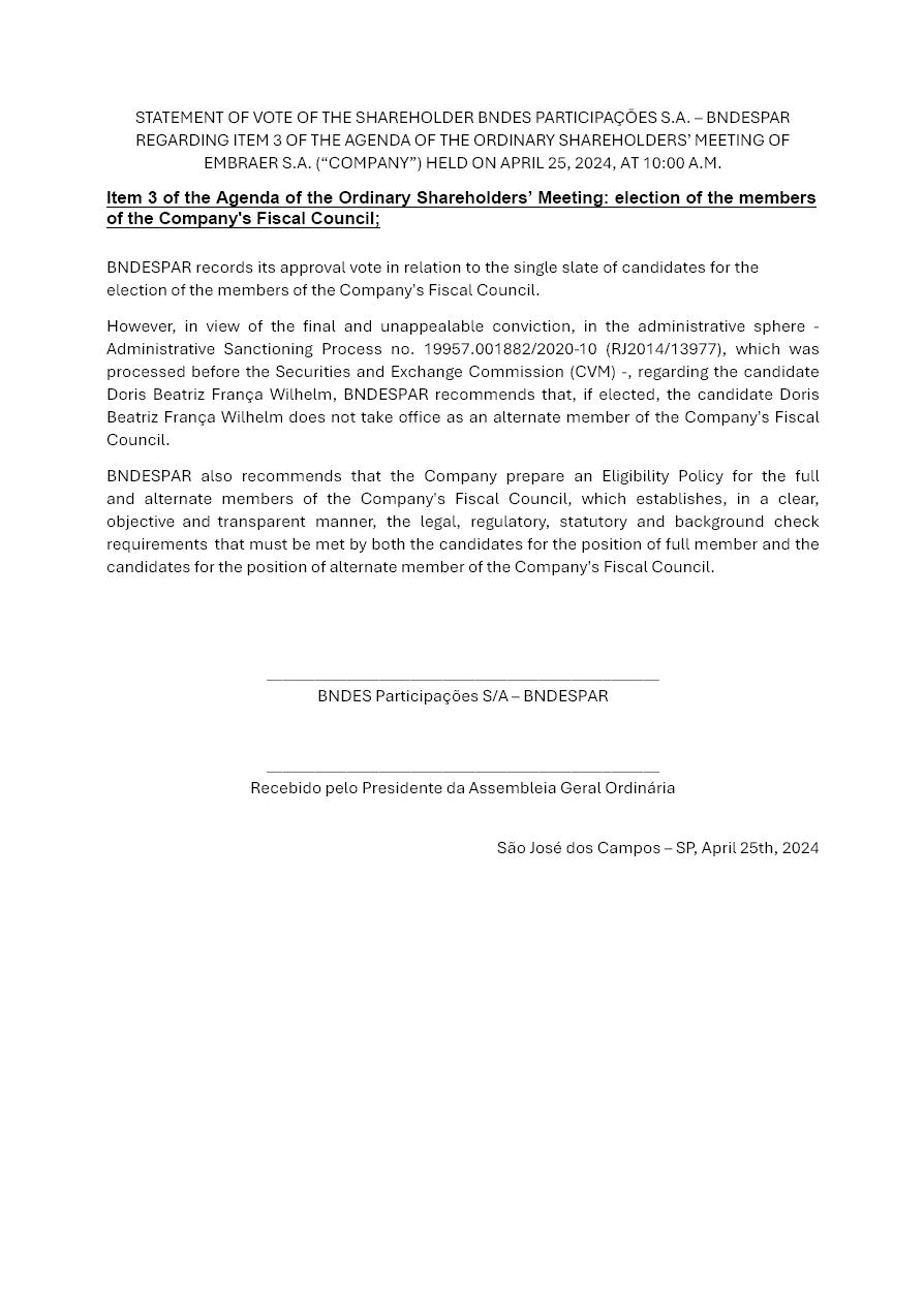 | 2024年4月25日召开的Embraer S.A.年度股东大会会议记录连发 | ![]() |