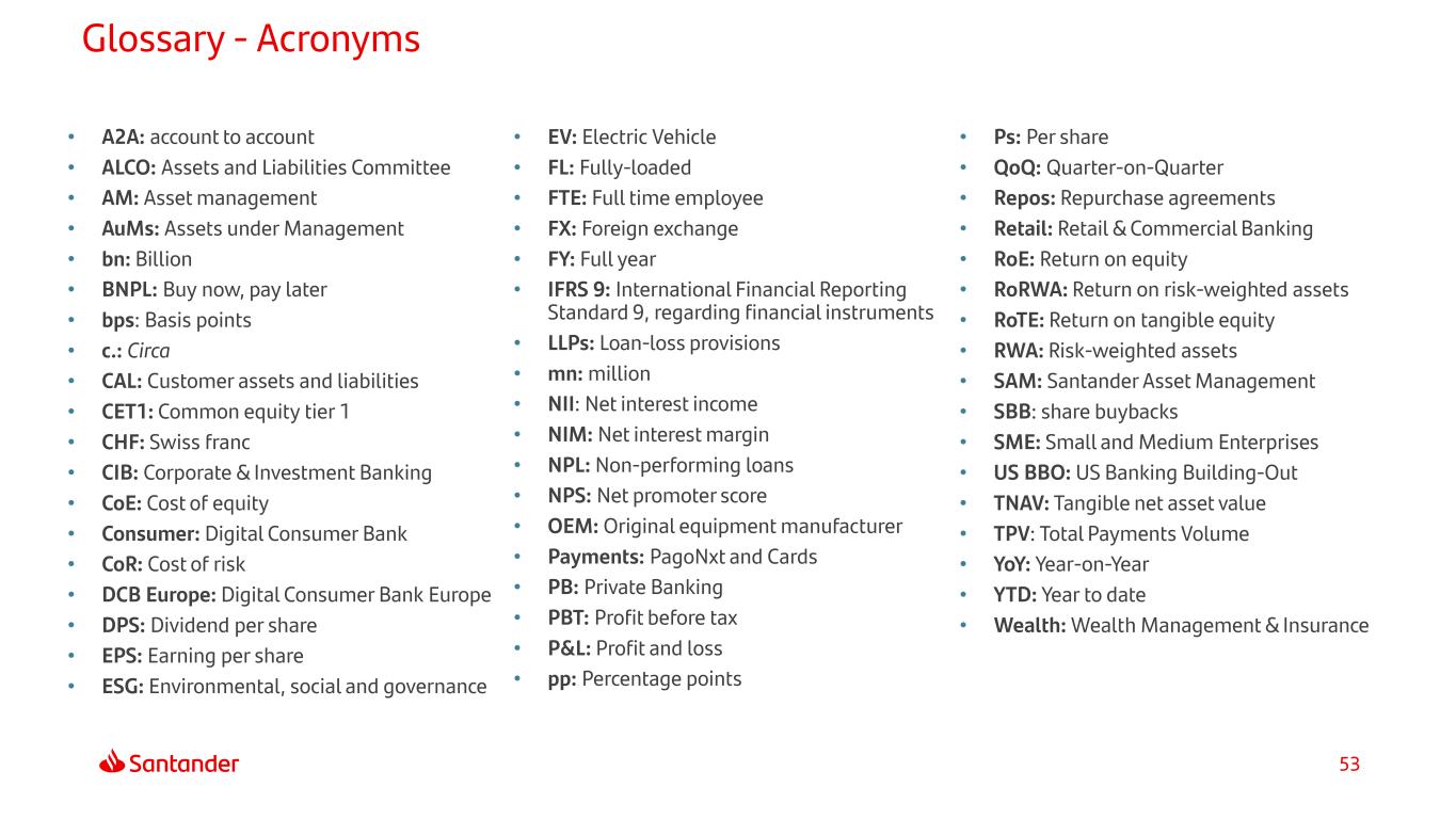 53词汇表-首字母缩略词• A2A:账户到账户• ALCO:资产和负债委员会• AM:资产管理•管理资产规模:管理下资产• bn:十亿• BNPL:现在购买,以后付款• bps:基点• c.:CIRCA • CAL:客户资产和负债• CET1:普通股一级•瑞郎:瑞士法郎• CIB:企业与投资银行• CoE:权益成本•消费者:数字消费者银行• CoR:风险成本• DCB Europe:数字消费者银行欧洲• DPS:每股股息• EPS:每股收益• ESG:环境,社会与治理• EV:电动汽车• FL:满载• FTE:全职员工•外汇:外汇• FY:全年• IFRS 9:国际财务报告准则9,关于金融工具• LLP:贷款损失准备• mn:百万• NII:净利息收入• NIM:净息差• NPL:不良贷款• NPS:净发起人评分• OEM:原始设备制造商•支付:PagoNXT和Cards • PB:私人银行业务• PBT:税前利润•损益:利润和亏损• pp:百分点• PS:每股•环比:环比:回购协议•零售:零售&商业银行• ROE:股本回报率• RORWA:风险加权资产回报率• ROTE:有形股本回报率• RWA:风险加权资产• SAM:桑坦德资产管理• SBB:股票回购•中小企业:中小企业•美国BBO:美国银行业建设• TNAV:有形资产净值•冠捷科技:总付款量•同比:同比•年初至今•财富:财富管理与保险