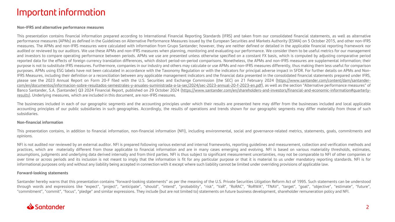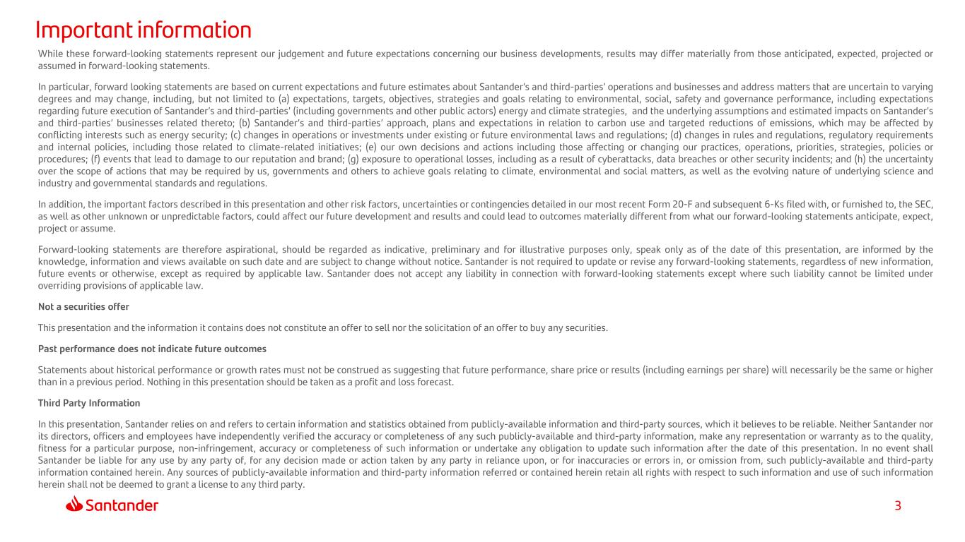 2重要信息非国际财务报告准则和替代业绩计量本演示文稿包含根据国际财务报告准则(IFRS)编制并取自我们合并财务报表的财务信息,以及欧洲证券和市场管理局(ESMA)于2015年10月5日发布的替代业绩计量指南中定义的替代业绩计量(APM),以及其他非国际财务报告准则计量。APM和非IFRS措施是根据Grupo Santander提供的信息计算得出的;然而,它们既没有在适用的财务报告框架中定义或详细说明,也没有经过我们的审计师审计或审查。我们在规划、监测和评估我们的业绩时使用这些APM和非IFRS措施。我们认为它们是我们的管理层和投资者比较不同时期经营业绩的有用指标。除非另有规定,否则我们使用的APM是在恒定外汇基础上呈现的,这是通过调整比较期间报告的数据来计算外币换算差异的影响,这会扭曲期间间的比较。尽管如此,APM和非IFRS措施是补充信息;它们的目的不是替代IFRS措施。此外,我们行业中的公司和其他公司可能会以不同的方式计算或使用APM和非IFRS措施,从而降低了它们在比较方面的用处。使用ESG标签的APM未根据分类法规或SFDR中的主要不利影响指标进行计算。有关APM和非IFRS措施的更多详细信息,包括其定义或任何适用的管理指标与根据IFRS编制的合并财务报表中列报的财务数据之间的调节,请参阅2024年2月21日提交给美国证券交易委员会(SEC)的2023表格20-F年度报告(https://www.santander.com/content/dam/santander-com/en/documentos/informacion-sobre-resultados-semestrales-y-anuales-suministrada-a-la-sec/2024/sec-2023-annual-20-f-2023-en.pdf),以及2024年10月29日发布的Banco Santander, S.A.(Santander)2024年第三季度财务报告“替代业绩措施”部分(https://www.santander.com/本文件中包含的基础措施是非国际财务报告准则措施。我们每个地区分部中包含的业务以及在此展示其结果所依据的会计原则可能与我们在这些地区的公共子公司所包含的业务和当地适用的会计原则有所不同。因此,我们的地理分部显示的运营结果和趋势可能与这些子公司的结果大不相同。非财务信息本演示文稿除财务信息外,还包含非财务信息(NFi),包括与环境、社会和治理相关的指标、声明、目标、承诺和意见。NFI不接受外部审计师的审计或审查。NFi是根据各种外部和内部框架、报告准则以及计量、收集和核查方法和做法编制的,这些方法和做法与适用于财务信息的方法和做法大不相同,并且在许多情况下正在出现和演变。NFI基于内部和第三方得出的各种重要性阈值、估计、假设、判断和基础数据。因此,NFI受到重大计量不确定性的影响,可能无法与其他公司的NFI进行比较,或随着时间的推移或跨时期进行比较,其纳入并不意味着该信息适合于任何特定目的,或根据强制性报告标准,它对我们很重要。NFI仅供参考,不接受与之相关的任何责任,除非根据适用法律的压倒一切的规定不能限制此类责任。前瞻性陈述桑坦德银行在此警告称,根据1995年美国《私人证券诉讼改革法案》的含义,本演示文稿包含“前瞻性陈述”。这类陈述可以通过“预期”“项目”“预期”“应该”“打算”“概率”“风险”“风险价值”“RORAC”“RORWA”“TNAV”“目标”“目标”“目标”“估计”“未来”“承诺”“承诺”“重点”“承诺”等类似表述来理解。它们包括(但不限于)关于未来业务发展、股东薪酬政策和NFi的声明。