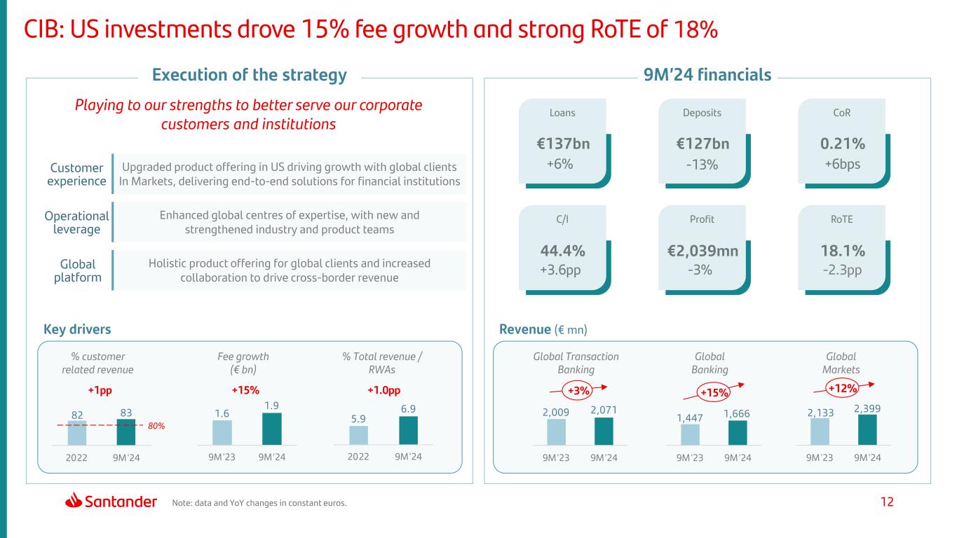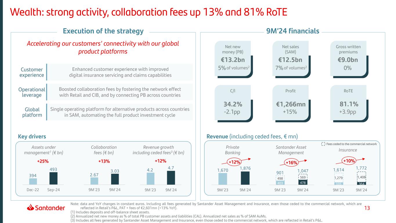 133353641,2791,4081,6141,772 9M‘23 9M’24 4034784985699011,047 9M‘23 9M’24 + 16%私人银行收入(包括分出费用,百万欧元)财富:活动强劲,协作费增长13%和81% RoTE关键驱动因素加速我们的客户与我们的全球产品平台Santander Asset Management Insurance注:数据和同比变化,单位为不变欧元。包括Santander Asset Management和Insurance产生的所有费用,即使是割让给商业网络的费用,反映在Retail的损益中,PAT +费用为26.01亿欧元(同比+ 13%)。(1)包括存款和表外资产。(2)年化净新增资金占总PB客户资产负债(CAL)的百分比。年化净销售额占SAM管理资产规模的百分比。(3)包括Santander Asset Management和Insurance产生的所有费用,即使是割让给商业网络的费用,也反映在Retail的P & L中。协作费(十亿欧元)包括分出费用在内的收入增长3(十亿欧元)管理资产1(十亿欧元)战略执行情况+ 25% + 13%分出给商业网络的费用通过改进的数字保险服务和理赔能力增强客户体验客户体验通过培养与Retail和CIB的网络效应,以及通过连接跨国家的PB,SAM中跨国家替代产品的单一运营平台,提高了协作费,自动化全产品投资周期运营杠杆全球平台利润净新货币(PB)净销售额(SAM)毛承保保费RoTEC/I成交量2成交量9M’24金融132亿欧元5% 125亿欧元7% 0% 90亿欧元34.2%-2.1pp欧元12.66亿欧元+ 15% 81.1% + 3.9pp 394493 Dec-22 Sep-24 2.67 3.03 9M‘23 9M’24 4.24.7 9M‘23 9M’24 1,6701,876 9M‘23 9M’24 + 12% + 10% + 12%