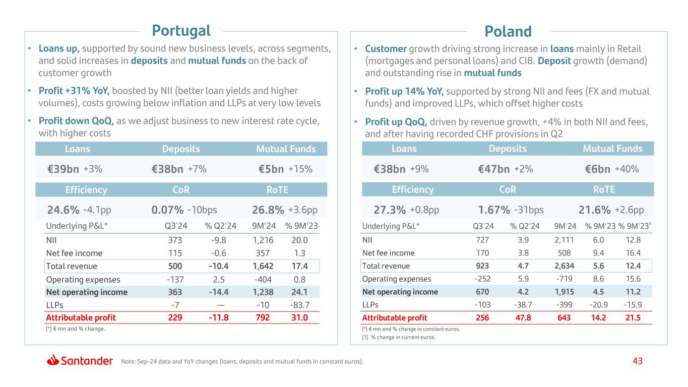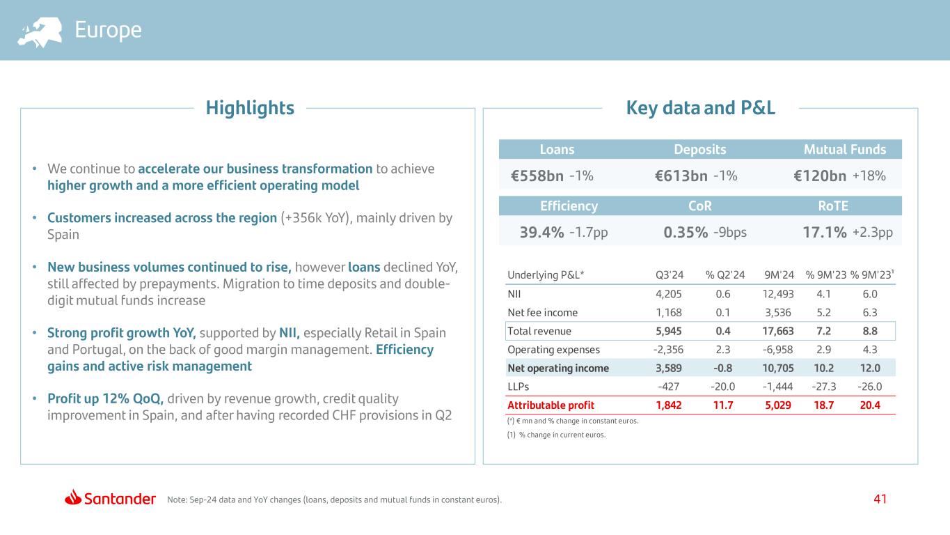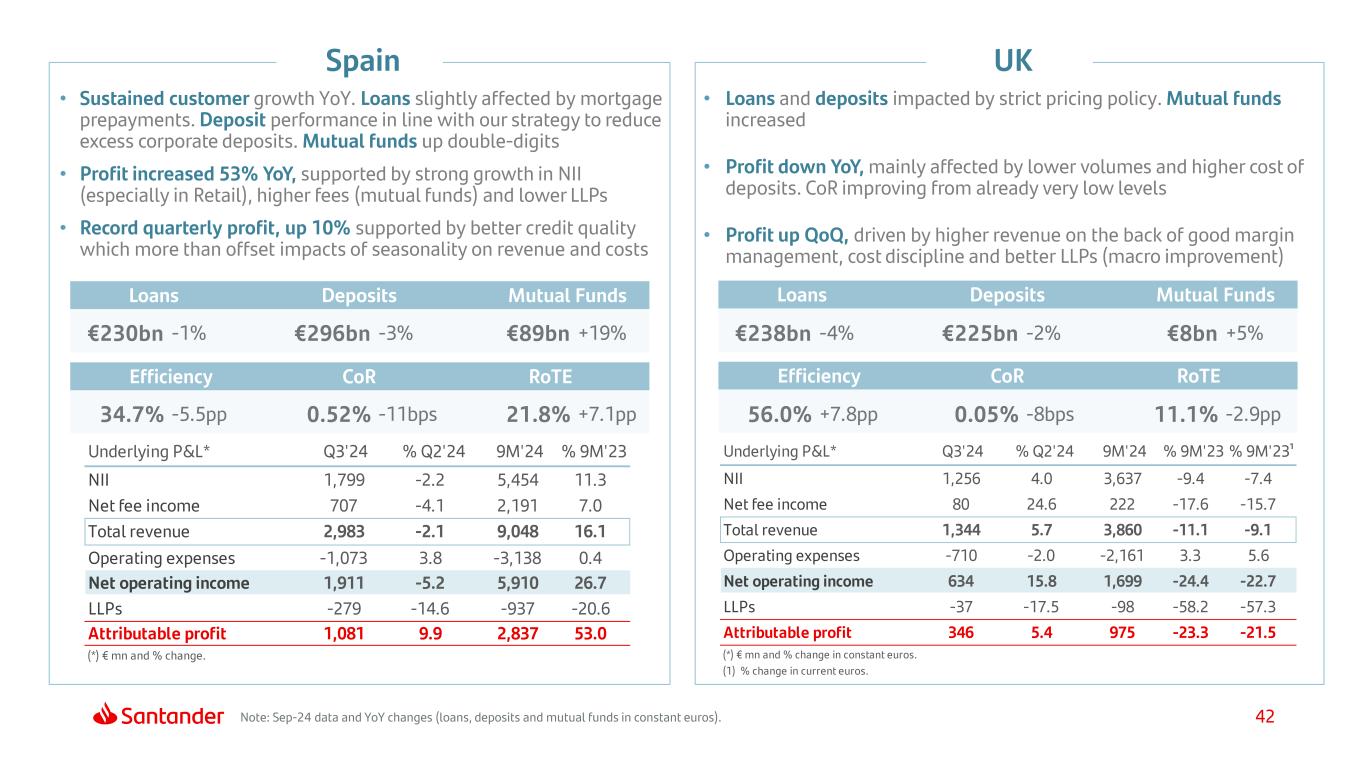 41要点注:Sep-24数据和同比变化(以固定欧元计的贷款、存款和共同基金)。关键数据和P & L Europe基础损益* Q3‘24% Q2’24 9M‘24% 9M’23% 9M ' 23丨NII 4,2050.612,4934.16.0净手续费收入1,1680.13,5365.26.3总收入5,9450.417,6637.28.8营业费用-2,356 2.3-6,9582.9 4.3净营业收入3,589-0.8 10,705 10.21 2.0 LLPs-427-20.0-1,444-27.3-26.0归属利润1,84211.75,02918.72 0.4(*)欧元和%变化不变欧元。(1)当前欧元变动%。Loans Deposits Mutual Funds Efficiency CoR RoTE 5580亿欧元-1 % 6130亿欧元-1 % 1200亿欧元+ 18% 39.4%-1.7pp 0.35%-9bps 17.1% + 2.3pp •我们继续加快业务转型,以实现更高的增长和更高效的运营模式•整个地区的客户增加(+ 35.6万同比),主要受西班牙推动•新业务量继续上升,但贷款同比下降,仍受预付款影响。向定期存款和两位数共同基金的迁移增加•强劲的利润同比增长,这得益于NII,尤其是西班牙和葡萄牙的零售,这得益于良好的利润率管理。效率提升和积极的风险管理•利润环比增长12%,受收入增长、西班牙信贷质量改善以及在第二季度录得瑞郎拨备后的推动