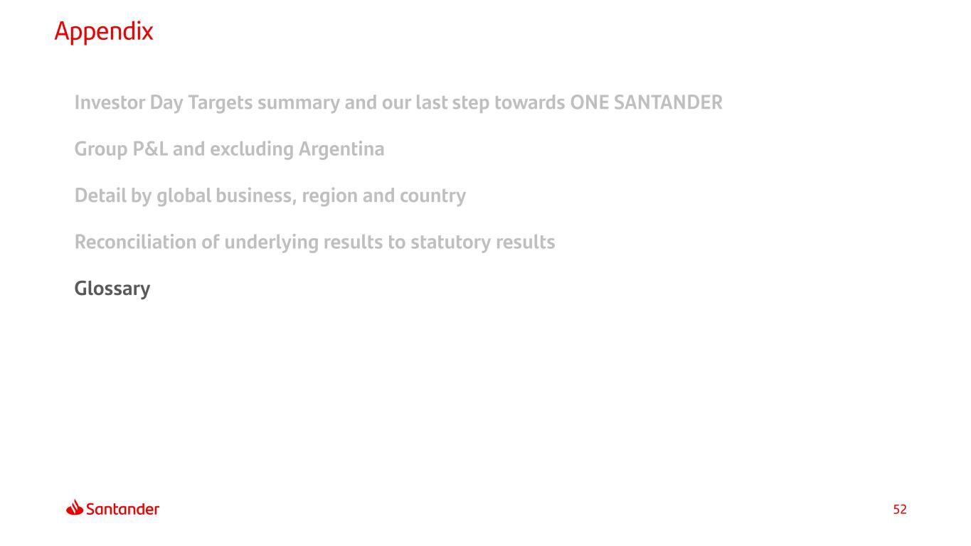52附录投资者日目标摘要和我们迈向一个桑坦德集团损益表和不包括阿根廷的最后一步按全球业务、地区和国家划分的详细信息基本结果与法定结果的对账词汇表