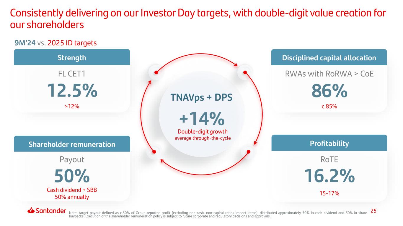 939.3% 18.5%-4.2pp + 3.6pp 40.7% 11.9%-1.9pp + 0.3pp 44.4% 18.1% + 3.6pp-2.3pp 34.2% 81.1%-2.1pp + 3.9pp 46.3% 22.7% + 1.3pp + 3.1pp 41.7% 16.2%-2.3pp + 1.3pp…以及通过我们的五项全球业务,利用我们的全球规模加速盈利增长52% 20% 13% 6% 9%收入(十亿欧元)对集团收入的贡献C/I ROTE 9M'242025 RoTE目标c.17 % > 14% > 20% c.60 % > 30% 15-17 %注:同比变化和收入不变欧元。对集团收入的贡献占总运营区域的百分比,不包括企业中心。Global businesses ' ROTEs are adjusted based on the Group’s deployed capital。零售消费者CIB Wealth Payments Group PagoNXT EBITDA利润率24.2 + 9% 9.6 + 5% 6.3 + 9% 2.7 + 13% 4.0 + 3% 46.2 + 8%