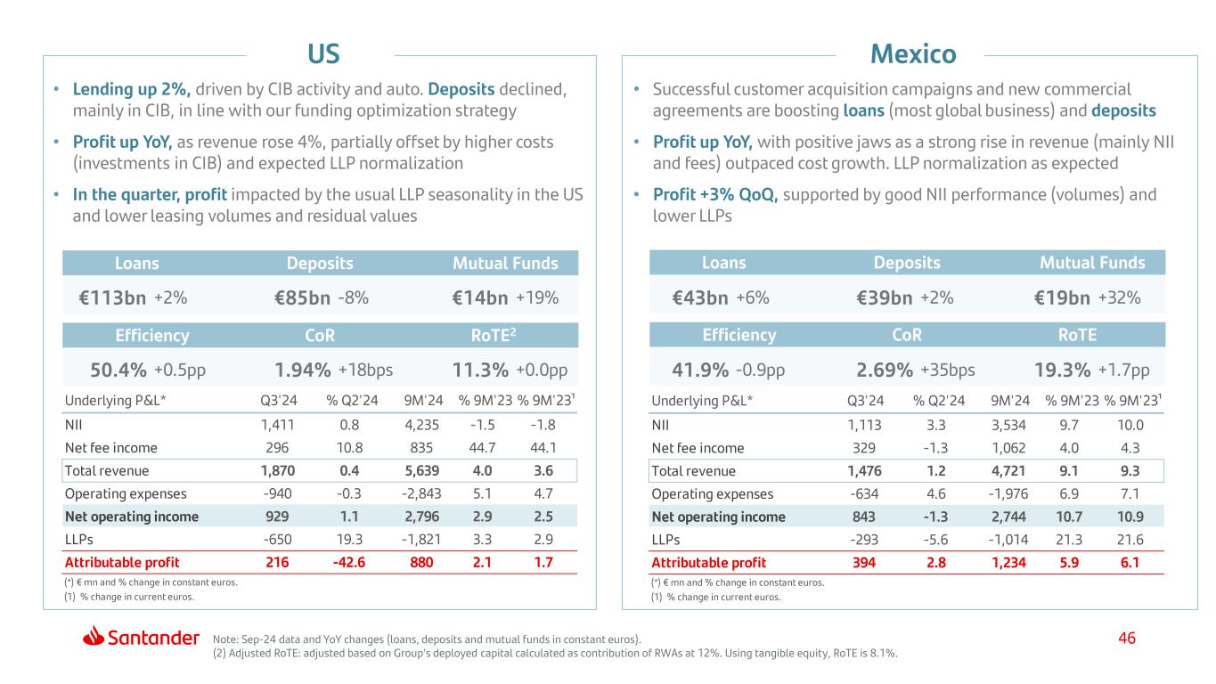 45注:Sep-24数据及同比变化(不变欧元的贷款、存款和共同基金)。北美重点关注关键数据和损益基础损益* Q3‘24% Q2’24 9M‘24% 9M’23% 9M ' 23丨NII 2,5272.07,7743.3 3.2净手续费收入6413.91,94118.5 18.6总收入3,3670.810,4066.26.1营业费用-1,6241.6-4,9765.85.7净营业收入1,7430.25,4296.66.5 LLPs-944 9.7-2,8379.08.8归属利润585-9.5 1,9311.7(*)百万欧元和%变化不变欧元。(1)当前欧元变动%。Loans Deposits Mutual Funds Efficiency CoR ROTE 1560亿欧元+ 3% 1240亿欧元-5 % 320亿欧元+ 26% 47.8%-0.2pp 2.15% + 24bps 11.2% + 0.8pp •专注于转型,利用我们在美国和墨西哥的全球业务的优势并继续我们的数字化转型•贷款增长3%,尤其是在墨西哥的零售和美国的CIB,这得益于客户增长(同比+ 2%)•存款业绩符合我们降低过剩企业存款成本的战略。共同基金强劲增长•收入增长6%,受美国CIB和我们在墨西哥的所有全球业务的强劲表现推动•成本上升,受通货膨胀以及美国对CIB和墨西哥零售数字化投资增加的影响。持续的效率提升,尤其是在美国的消费和商业以及墨西哥的CIB •利润同比增长2%,原因是净营业收入表现良好(+7%),这足以抵消受销量影响的LLP增加以及预期的COR正常化•季度收入增长,主要受墨西哥销量和CIB在美国的业绩推动。利润受到美国通常的LLP季节性以及较低的租赁量和残值的影响