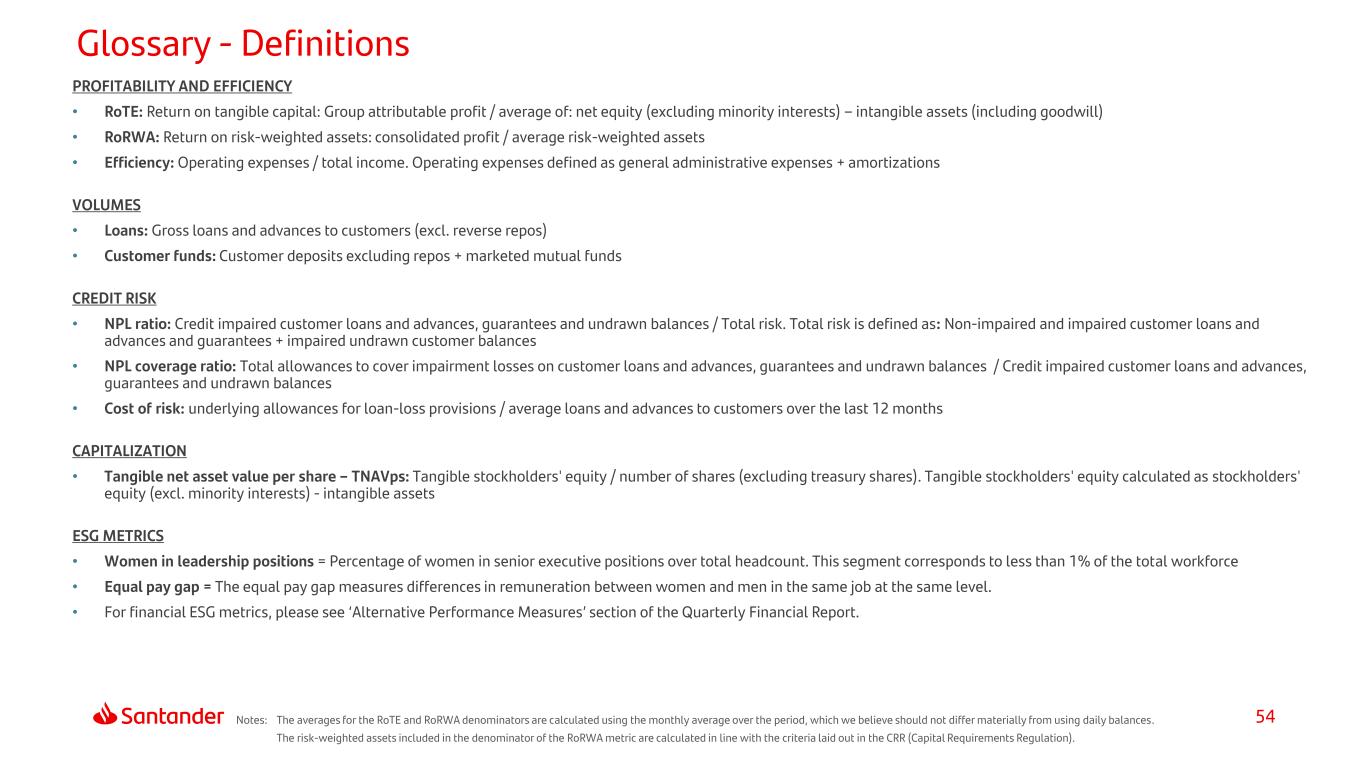 54词汇表-定义说明:RoTE和RORWA分母的平均值是使用该期间的月度平均值计算的,我们认为这与使用每日余额应该没有重大差异。RORWA指标分母中包含的风险加权资产是根据CRR(资本要求条例)中规定的标准计算的。盈利能力和效率• ROTE:有形资本回报率:集团应占利润/平均数:净权益(不包括少数股东权益)–无形资产(包括商誉)• RORWA:风险加权资产回报率:合并利润/平均风险加权资产•效率:运营费用/总收入。营业费用定义为一般管理费用+摊销额•贷款:客户贷款和垫款总额(不包括逆回购)•客户资金:客户存款不包括回购+市场化共同基金信用风险•不良率:信用减值客户贷款和垫款、担保和未提取余额/总风险。总风险定义为:未减值和减值的客户贷款和垫款及担保+减值的未提取客户余额•不良贷款覆盖率:用于覆盖客户贷款和垫款、担保和未提取余额的减值损失的总拨备/信用减值的客户贷款和垫款、担保和未提取余额•风险成本:贷款损失准备金的基本拨备/过去12个月客户平均贷款和垫款资本化•每股有形净资产值– TNAVPS:有形股东权益/股份数量(不包括库存股)。以股东权益(不包括少数股东权益)计算的有形股东权益-无形资产ESG指标•担任领导职务的女性=担任高级管理职务的女性占总人数的百分比。这一部分对应的劳动力总人数不到1% •同工同酬差距=同工同酬差距衡量的是在同一级别从事同一工作的男女之间的薪酬差异。•有关财务ESG指标,请参阅季度财务报告的“替代绩效指标”部分。