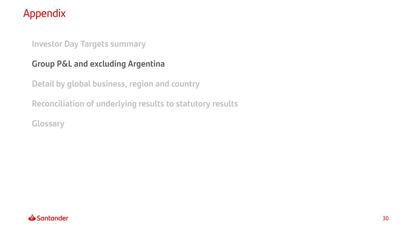 28附录投资者日目标摘要集团损益和不包括阿根廷按全球业务、地区和国家划分的详细信息基础结果与法定结果的对账词汇表每个季度定期提供的附录中的其他信息可在与本演示文稿一起在集团公司网站上发布的题为“补充信息”的文件中找到