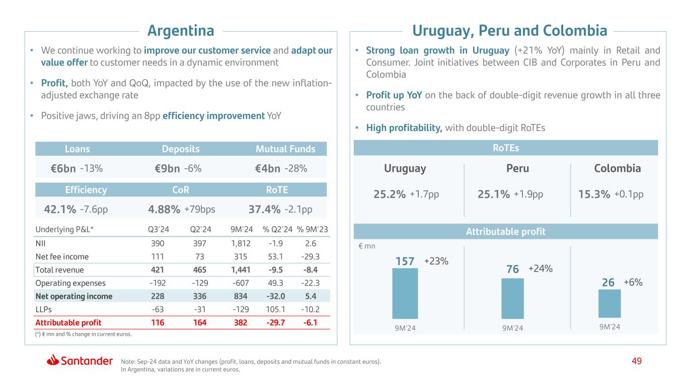 49157 9M'24注:Sep-24数据和同比变化(利润、贷款、存款和共同基金不变欧元)。在阿根廷,变化以当前欧元计算。阿根廷阿根廷y乌拉圭乌拉圭、秘鲁和哥伦比亚乌拉圭秘鲁哥伦比亚ROTES欧元百万应占利润+ 24% + 6% 2625.2% + 1.7pp 25.1% + 1.9pp 15.3% + 0.1pp 76 9m‘24 26 9m’24 + 23%贷款存款共同基金效率CoR ROTE欧元60亿-13 %欧元90亿-6 %欧元40亿-28 % 42.1%-7.6pp 4.88% + 79bps 37.4%-2.1pp •我们继续努力改善我们的客户服务,并在动态环境中调整我们的价值提供以适应客户需求•利润同比和环比,受到使用新的通胀调整汇率的影响•积极的下巴,推动效率同比提升8pp •乌拉圭贷款增长强劲(+ 21% YoY),主要集中在零售和消费领域。CIB与秘鲁和哥伦比亚企业的联合举措•在这三个国家的收入均实现两位数增长的背景下,利润同比增长•高盈利能力,两位数的RoTES是损益的基础* Q3‘24 Q2’24 9M‘24 % Q2’24 % 9M'23 NII3903971,812-1.9 2.6净费用收入1117331553.1-29.3总收入4214651,441-9.5-8.4营业费用-192-129-607 49.3-22.3净营业收入228336834-32.0 5.4 LLPs-63-31-129 105.1-10.2归属利润116164382-29.7-6.1(*)欧元和当前欧元的百分比变化。