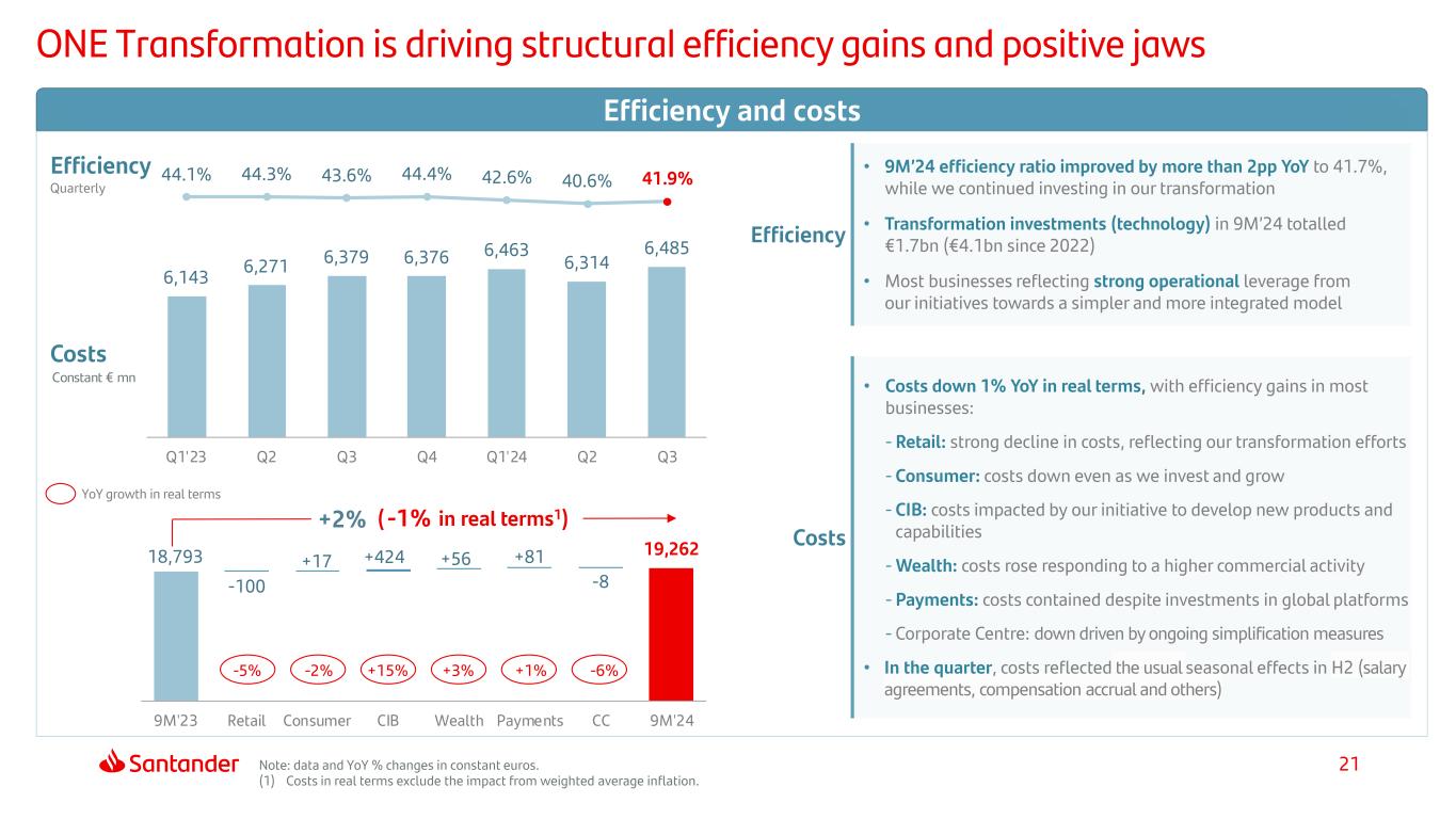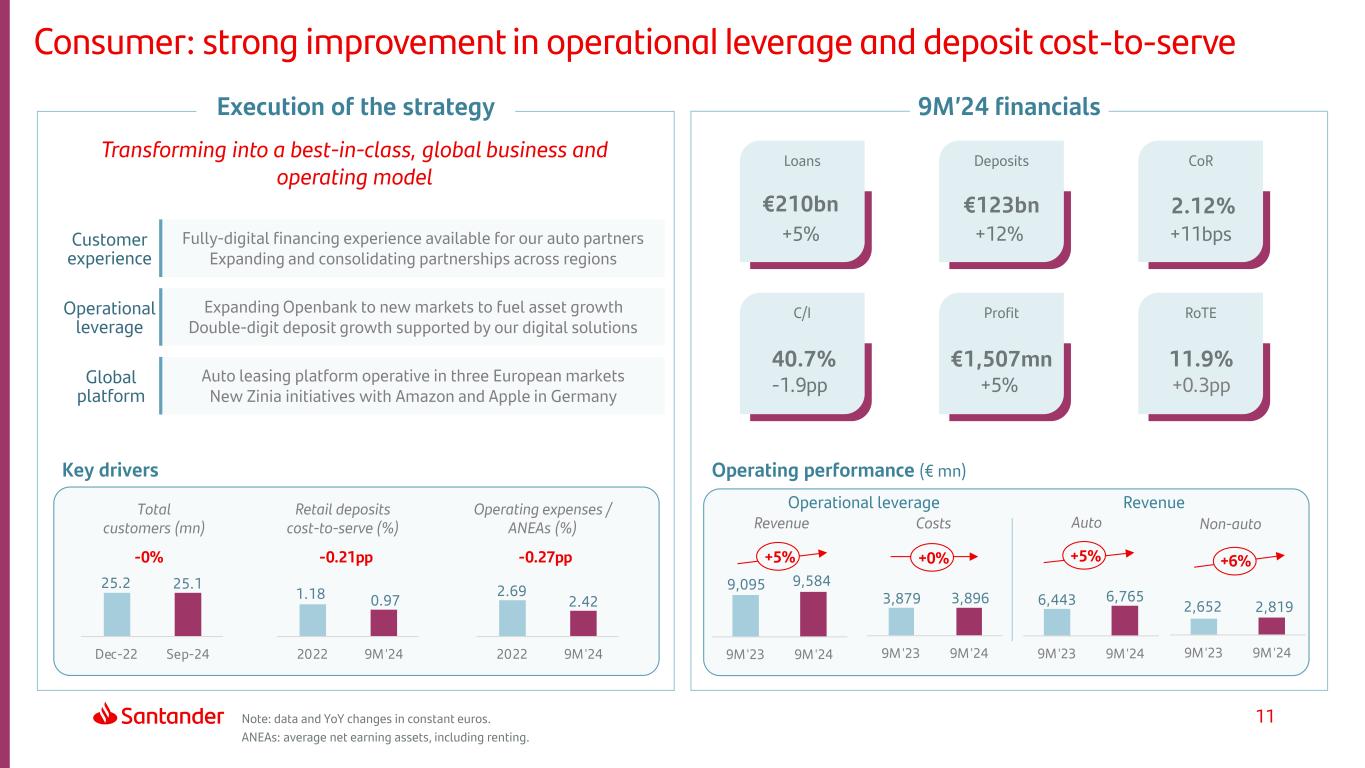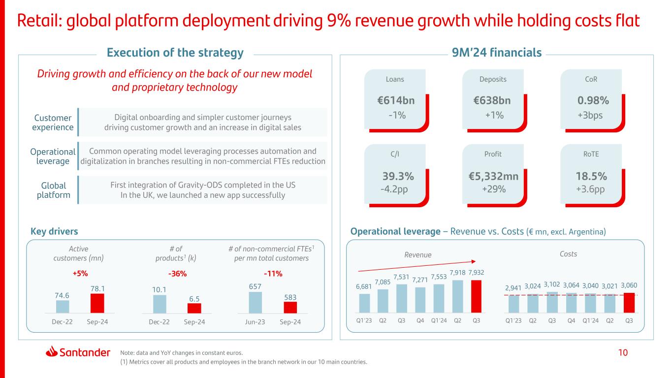 102,9413,0243,1023,0643,0403,0213,060 Q1‘23 Q2 Q3 Q3 Q4 Q1’24 Q2 Q3零售:全球平台部署推动收入增长9%,同时保持产品成本持平# 1(k)#非商业FTES1每百万总客户活跃客户(mn)战略执行在我们的新模式和专有技术的支持下推动增长和效率的关键驱动因素注:数据和同比变化,单位为不变欧元。(1)指标覆盖我们10个主要国家分支网络中的所有产品和员工。运营杠杆–收入与成本(百万欧元,不含。阿根廷)收入成本9m'24财务利润+ 5%-36 %-11 %数字化入职和更简单的客户旅程推动客户增长和数字销售客户体验增加共同运营模式利用分支机构的流程自动化和数字化导致非商业性FTE减少在美国完成的Gravity-ODS的首次整合在英国完成,我们成功推出新应用程序运营杠杆全球平台贷款存款COR RoTEC/I 6140亿欧元-1 % 6380亿欧元+ 1% 0.98% + 3bps 39.3%-4.2pp欧元533.2亿欧元+ 29% 18.5% + 3.6pp 6,6817,0857,5317,2717,5537,9187,932 Q1‘23 Q2 Q3 Q4 Q1’24 Q2 Q3 74.678.1 Dec-22 Sep-24 10.16.5 Dec-22 Sep-24 657 583 Jun-23 Sep-24