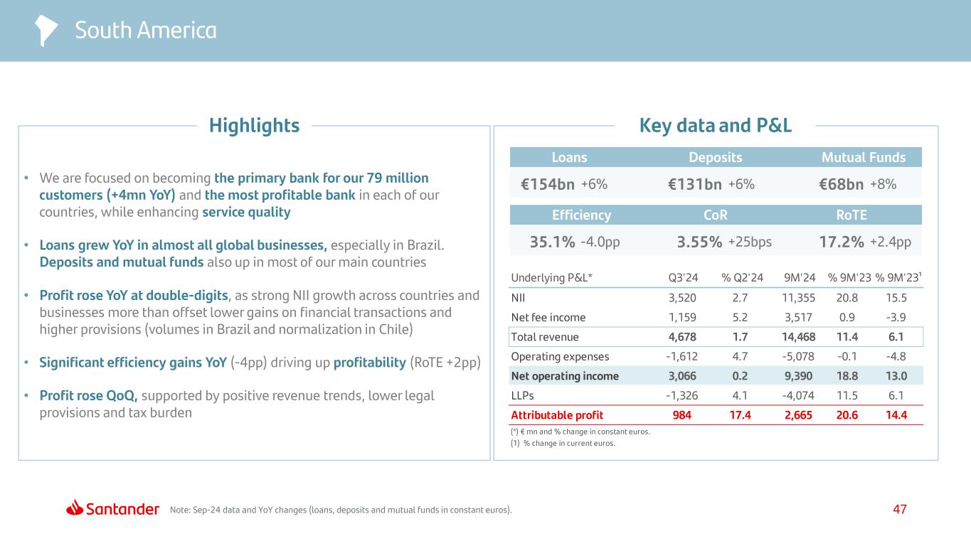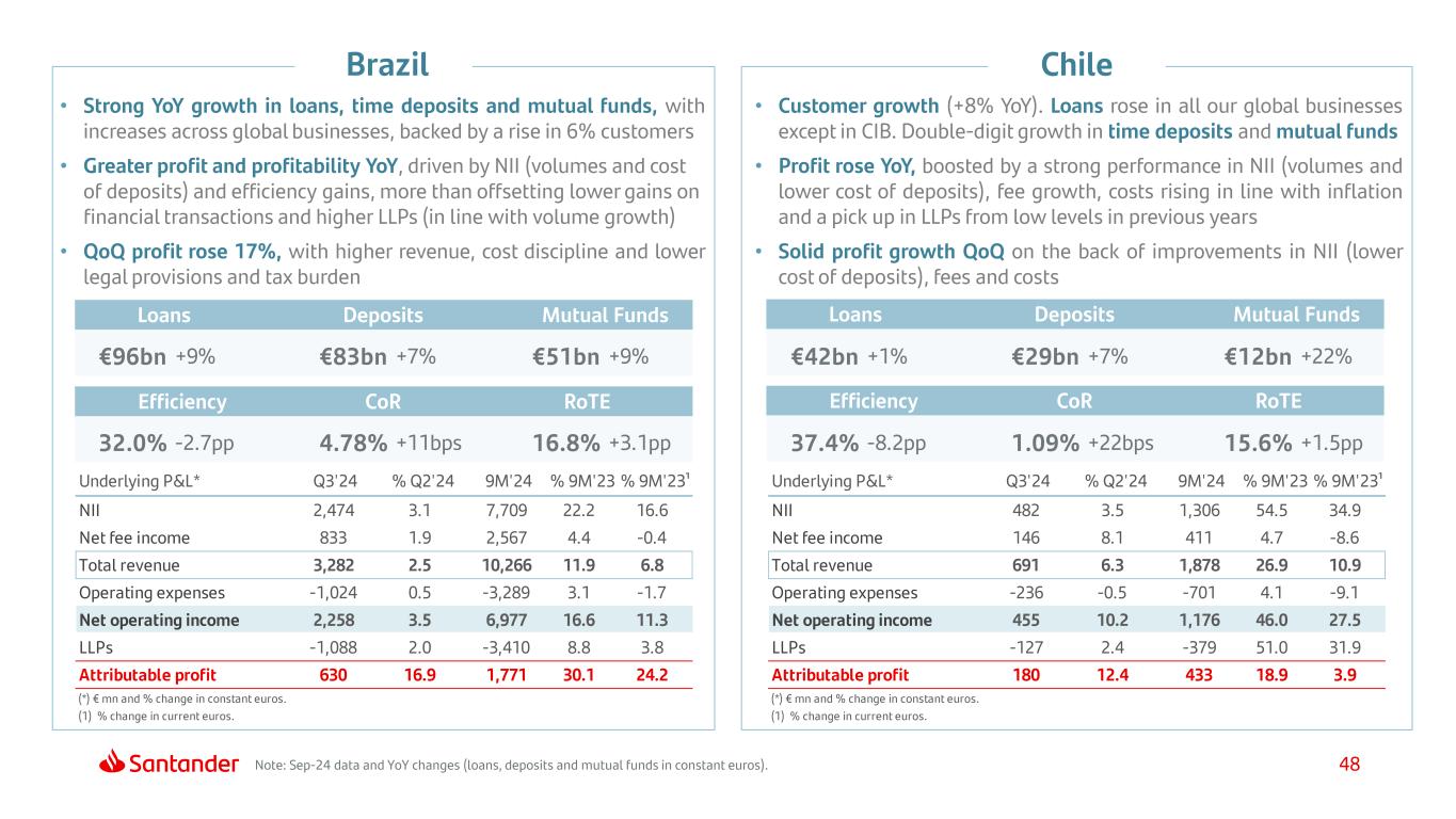 47南美注:Sep-24数据和同比变化(贷款、存款和共同基金不变欧元)。重点介绍关键数据和损益基础损益* Q3‘24% Q2’24 9M‘24% 9M’23% 9M ' 23丨NII 3,5202.711,35520.81 5.5净手续费收入1,1595.23,5170.9-3.9总收入4,6781.7 14,468 11.46.1营业费用-1,6124.7-5,078-0.1-4.8净营业收入3,0660.29,39018.81 3.0 LLPs-1,3264.1-4,07411.56.1归属利润98417.42,66520.61 4.4(*)欧元和%变化不变欧元。(1)当前欧元变动%。Loans Deposits Mutual Funds Efficiency CoR ROTE 1540亿欧元+ 6% 1310亿欧元+ 6% 680亿欧元+ 8% 35.1%-4.0pp 3.55% + 25bps 17.2% + 2.4pp •我们专注于成为我们7900万客户的主要银行(同比+ 400万)和我们每个国家最赚钱的银行,同时提高服务质量•几乎所有全球业务的贷款都同比增长,尤其是在巴西。我们大多数主要国家的存款和共同基金也有所增长•利润同比增长达到两位数,因为各国和企业强劲的NII增长抵消了金融交易收益下降和拨备增加(巴西的交易量和智利的正常化)•显着的效率提升同比(-4pp)推动盈利能力上升(RoTE + 2pp)•利润环比增长,这得益于积极的收入趋势、较低的法律拨备和税收负担