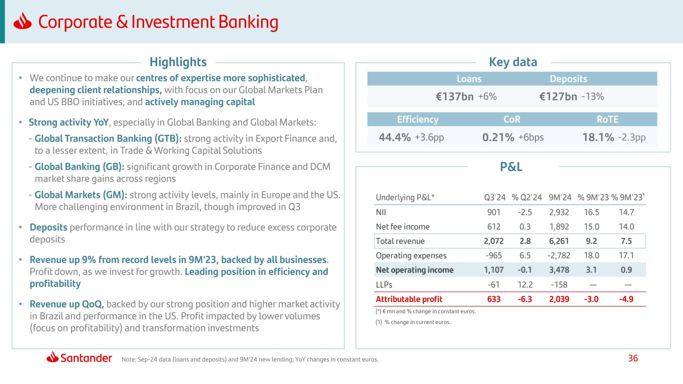 36贷款存款效率COR ROTE 1370亿欧元+ 6% 1270亿欧元-13 % 44.4% + 3.6pp 0.21% + 6bps 18.1%-2.3pp关键数据企业和投资银行基础损益* Q3‘24% Q2’24 9m‘24 % 9m’23 % 9m'23丨NII 901-2.5 2,93216.5 14.7净手续费收入6120.31,89215.01 4.0总收入2,0722.86,2619.27.5营业费用-965 6.5-2,78218.01 7.1净营业收入1,107-0.1 3,4783.10.9 LLPs-61 12.2-158 ——应占利润633-6.3 2,039-3.0-4.9(*)百万欧元和%变化不变欧元。(1)当前欧元变动%。P & L亮点注:Sep-24数据(贷款和存款)和9m'24新增贷款;按不变欧元计算的同比变化。•我们继续使我们的专业知识中心更加完善,深化客户关系,重点关注我们的全球市场计划和美国BBO计划,并积极管理资本•强劲的活动同比,特别是在全球银行和全球市场:-全球交易银行(GTB):出口融资活动强劲,在较小程度上,贸易和营运资本解决方案-全球银行(GB):企业融资显着增长和跨地区DCM市场份额增长-全球市场(GM):活动水平强劲,主要在欧洲和美国。巴西环境更具挑战性,尽管第三季度有所改善•存款表现符合我们减少过剩企业存款的战略•收入较23年9月的创纪录水平增长9%,得到所有业务的支持。利润下降,因为我们为增长而投资。在效率和盈利能力方面处于领先地位•收入环比增长,这得益于我们在巴西的强势地位和更高的市场活动以及在美国的表现。利润受销量下降影响(关注盈利能力)和转型投资