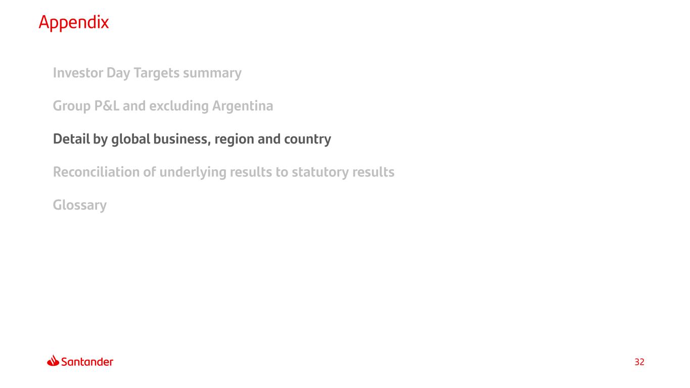 30附录投资者日目标摘要集团损益和不包括阿根廷按全球业务、地区和国家分列的详细信息基础结果与法定结果的对账词汇表