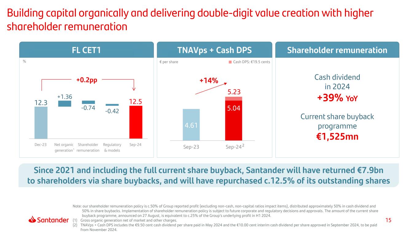 15注:我们的股东薪酬政策为集团报告利润的约50%(不包括非现金、非资本比率影响项目),派发约50%的现金股息和50%的股份回购。股东薪酬政策的实施取决于未来公司和监管部门的决定和批准。8月27日宣布的当前股份回购计划的金额相当于集团2024年上半年基本利润的约25%。(1)扣除市场和其他费用的有机发电毛额。(2)TNAVPS +现金DPS包括2024年5月支付的每股9.50美分现金股息和2024年9月批准的每股10.00美分中期现金股息,将从2024年11月开始支付。有机地建设资本并以更高的股东薪酬提供两位数的价值创造股东薪酬欧元每股现金DPS:19.5美分TNAVPS +现金DPSFL CET1 %自2021年以来,包括当前的全部股票回购,桑坦德银行将通过股票回购向股东返还79亿欧元,并将在2024年回购约12.5%的流通股+ 14%现金股息+ 39% YoY当前股票回购计划15.25亿欧元12.5-0.74-0.42 12.3 + 1.36 Dec-23净有机生成股东薪酬监管和模型Sep-24 1 + 0.2pp 4.6 15.04 5.23 Sep-23 Sep-24 2